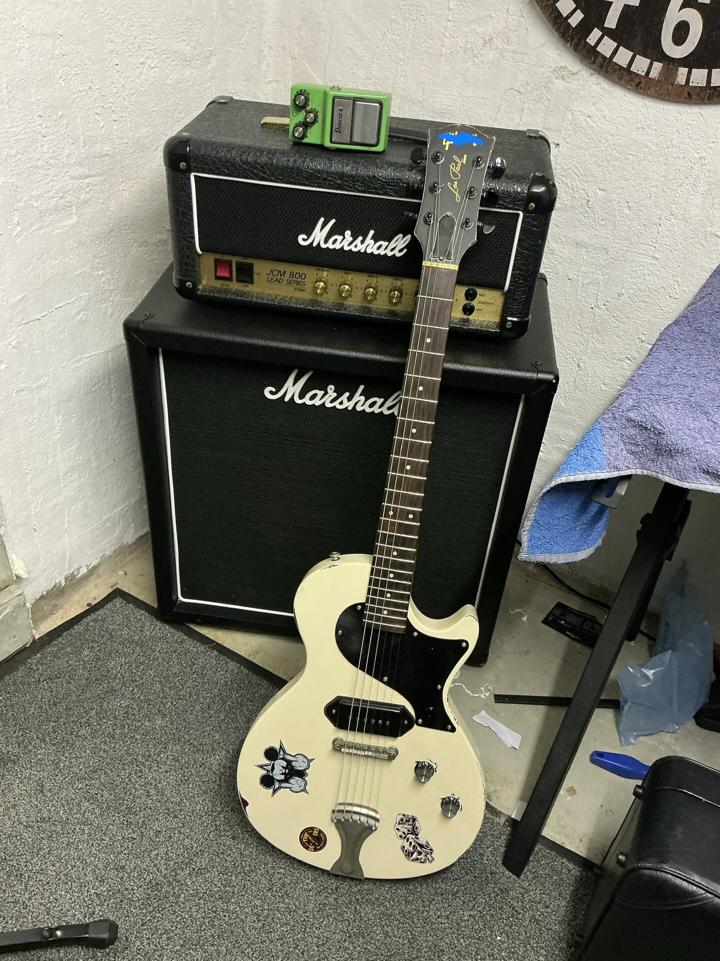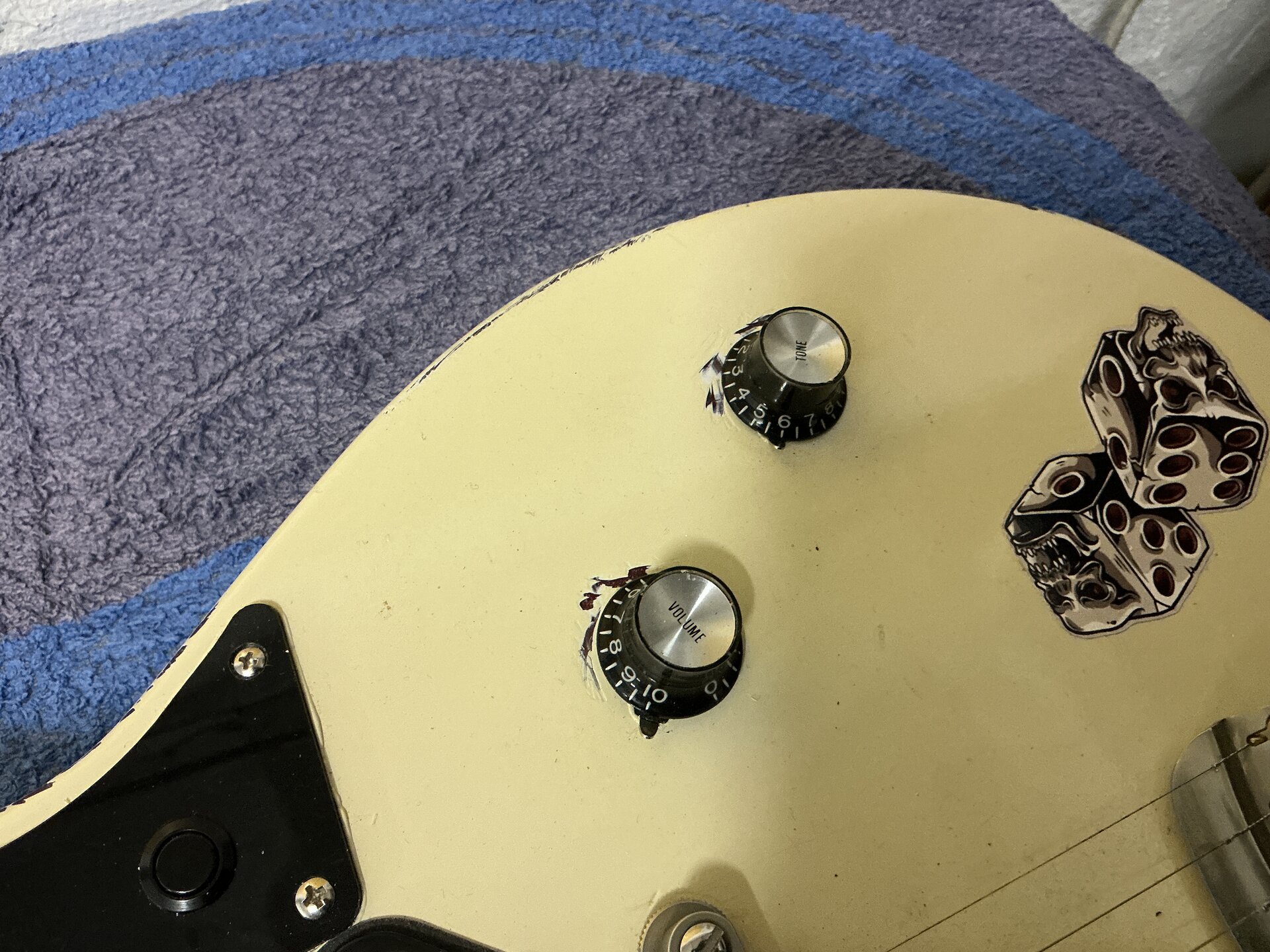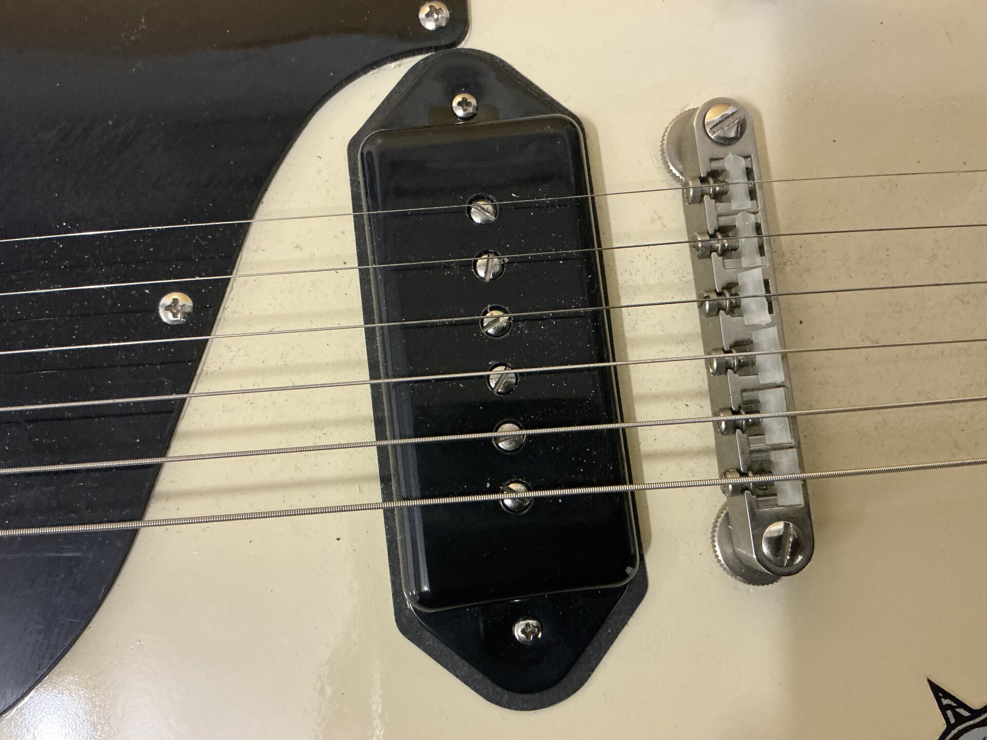 Und zu guter letzt ein Rocknrollbrett mit Mojo P90 Tonabnehmer,Killswitch,Webersattel und Nylonreiter in TV Yellow Roadworn,ein absolutes Unikat/Eigenbau,super Saitenlage,langes Sustain und fetter Sound.