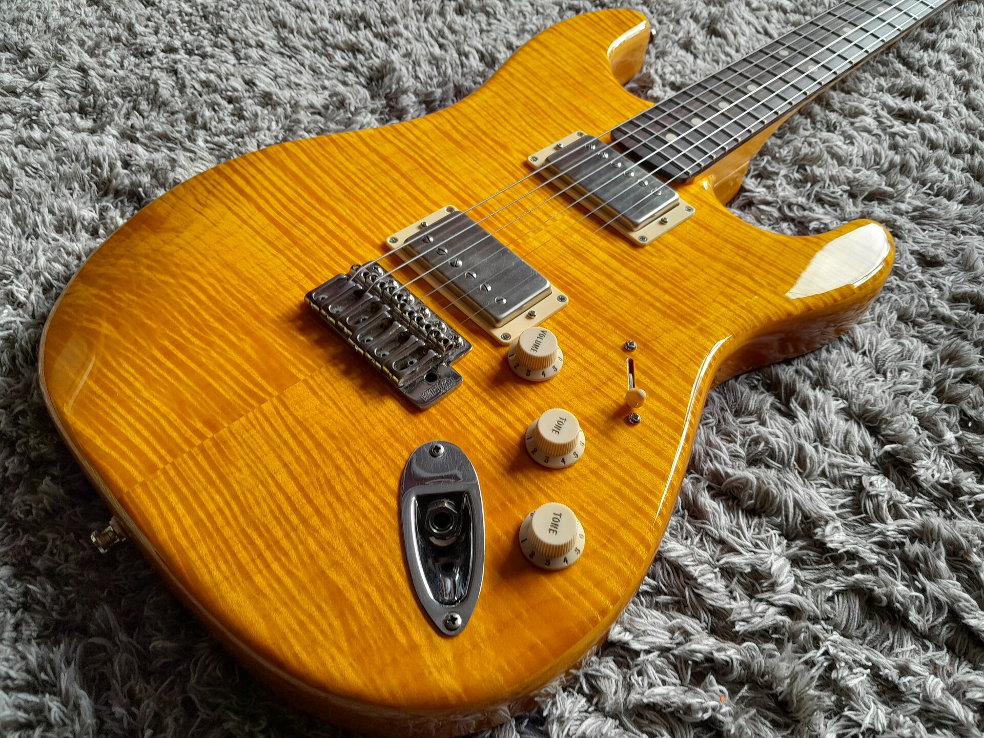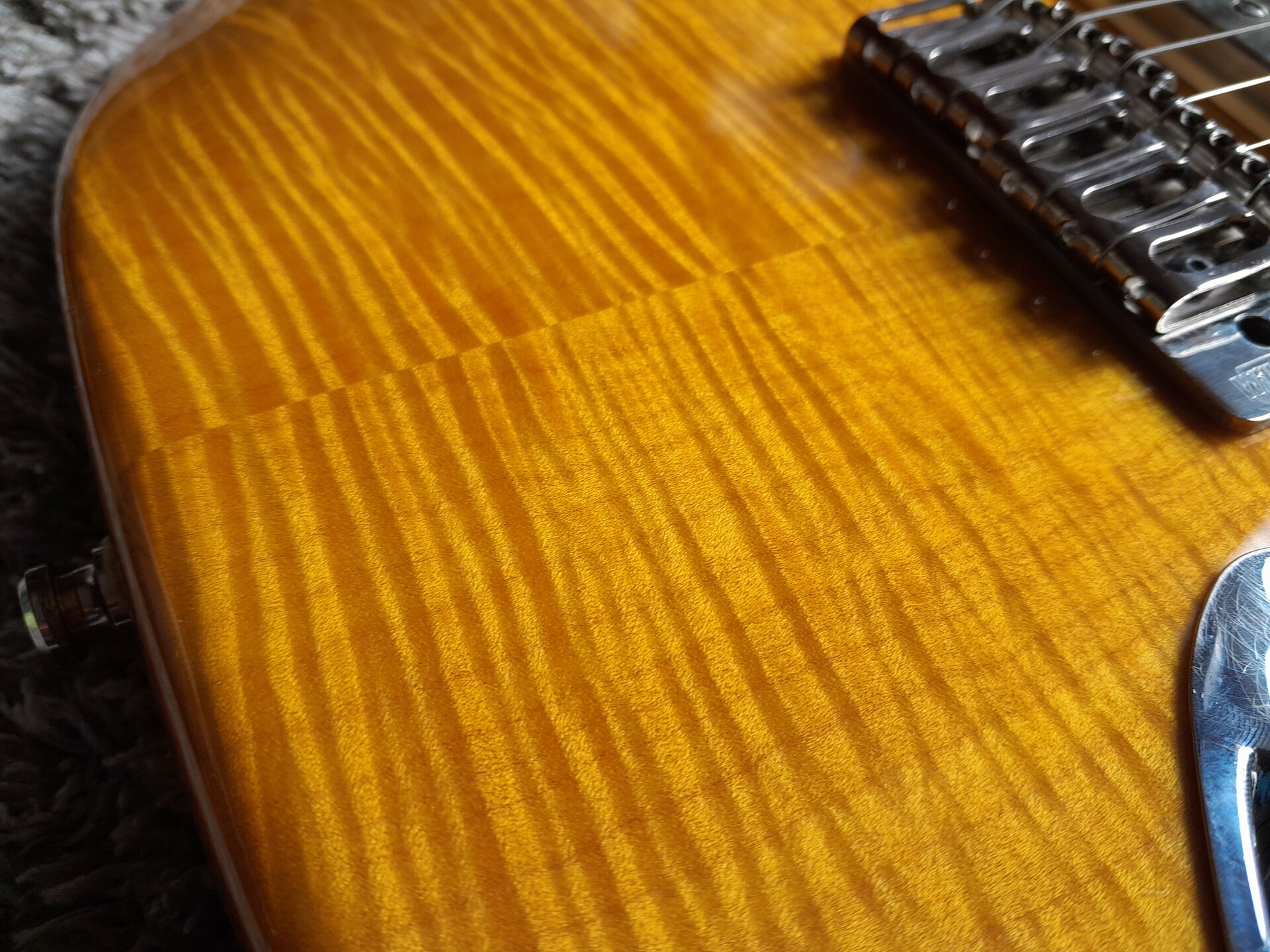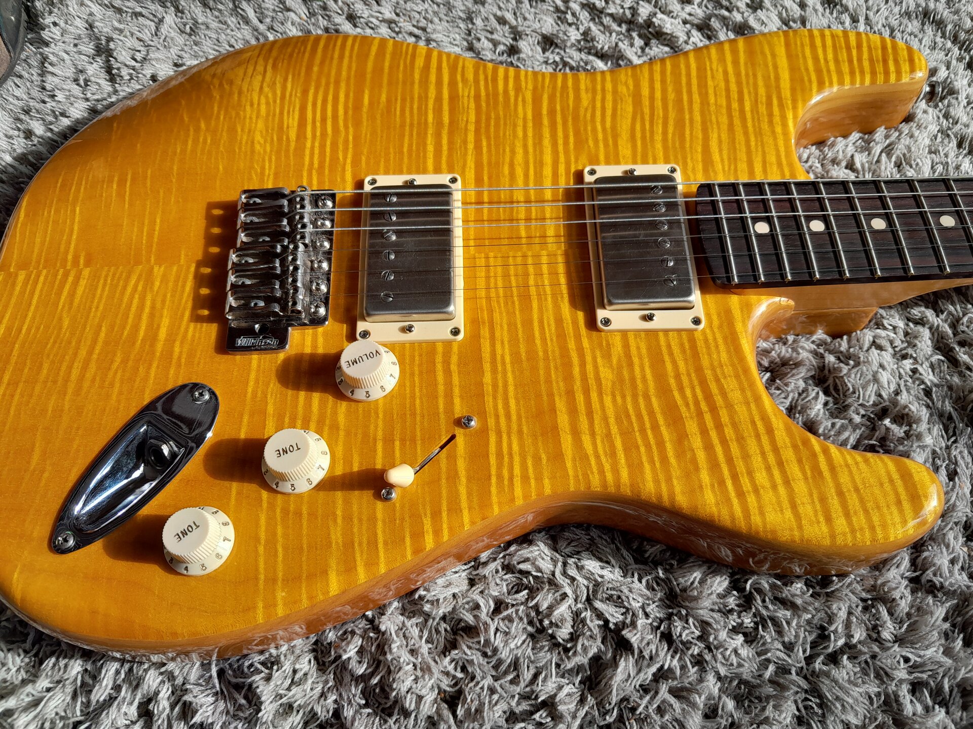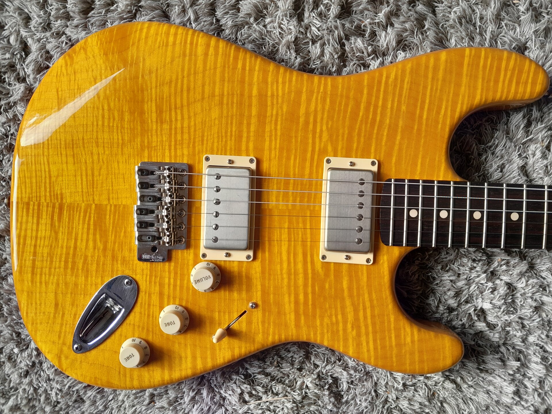 Leichter Warmoth-Body aus Erle mit AAA Flame Maple Top, der Body ist gelb lackiert, das Top aber ist transparent lackiert und gelb von Hand gebeizt(!), denn wenn man schon so viel Geld für ein massiv aufpreispflichtiges Unique-Choice-Top ausgibt (Scheiße, ich darf da nicht drüber nachdenken, Mannomann) dann will man, dass die Flammung geil 3D und optimal zur Geltung rüberkommt. Daher gebeizt.