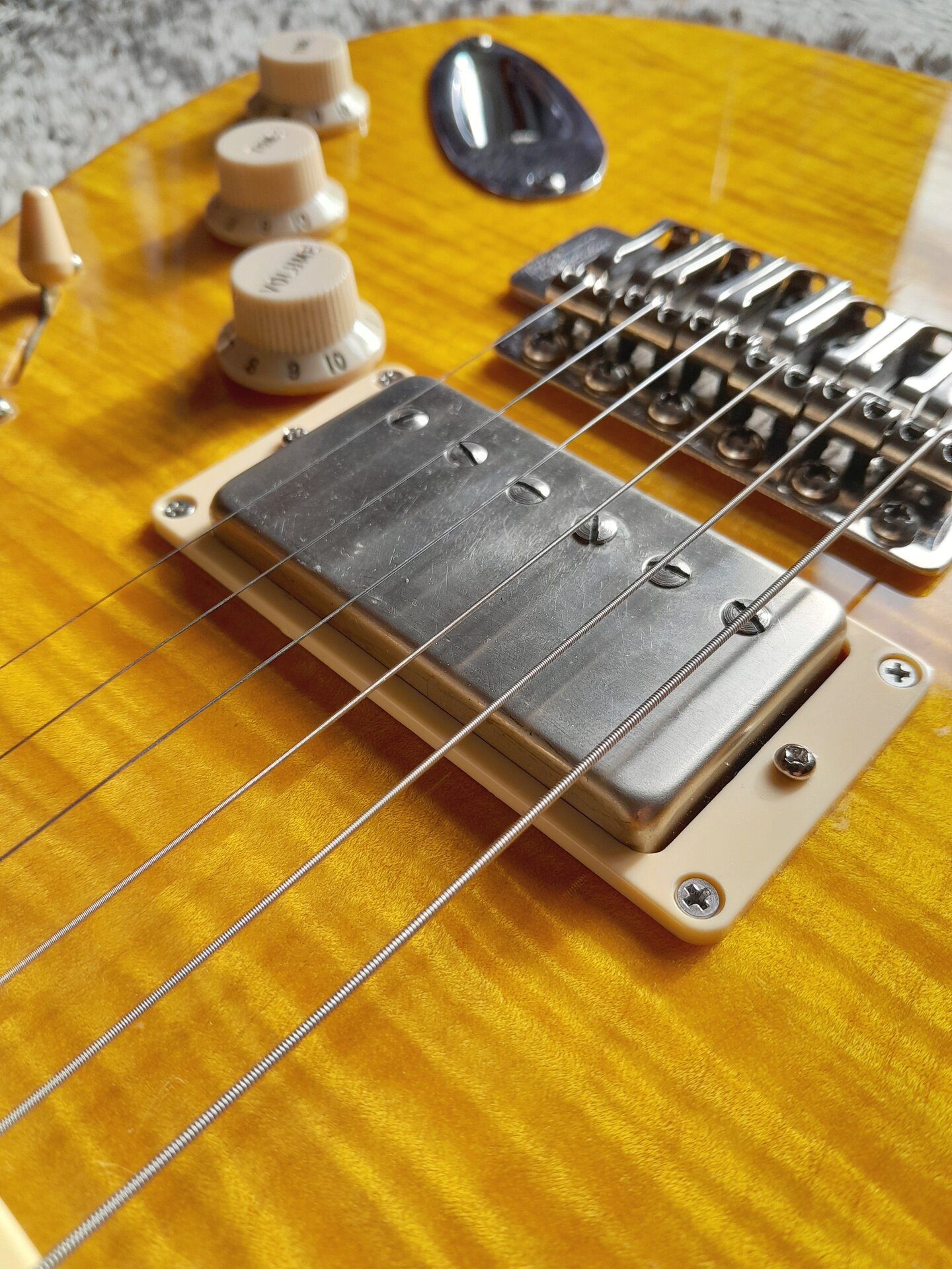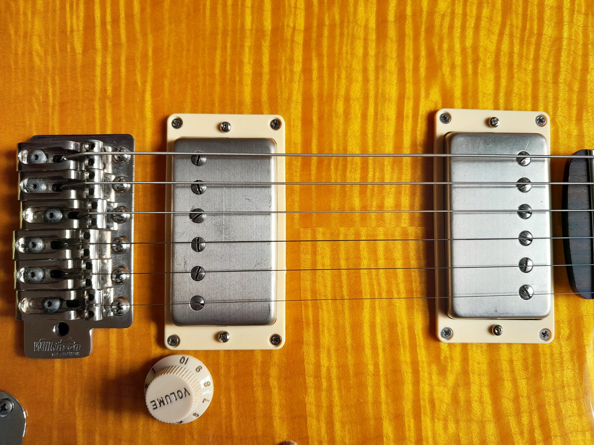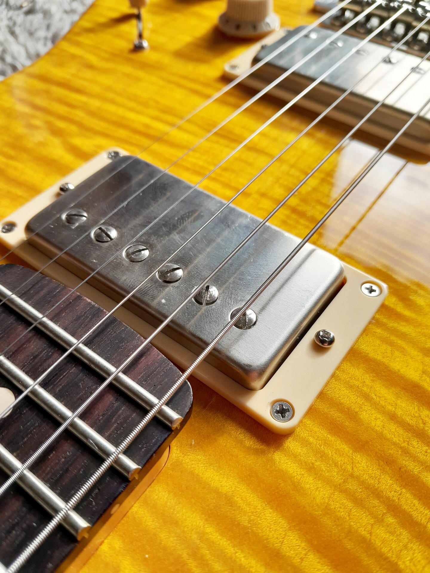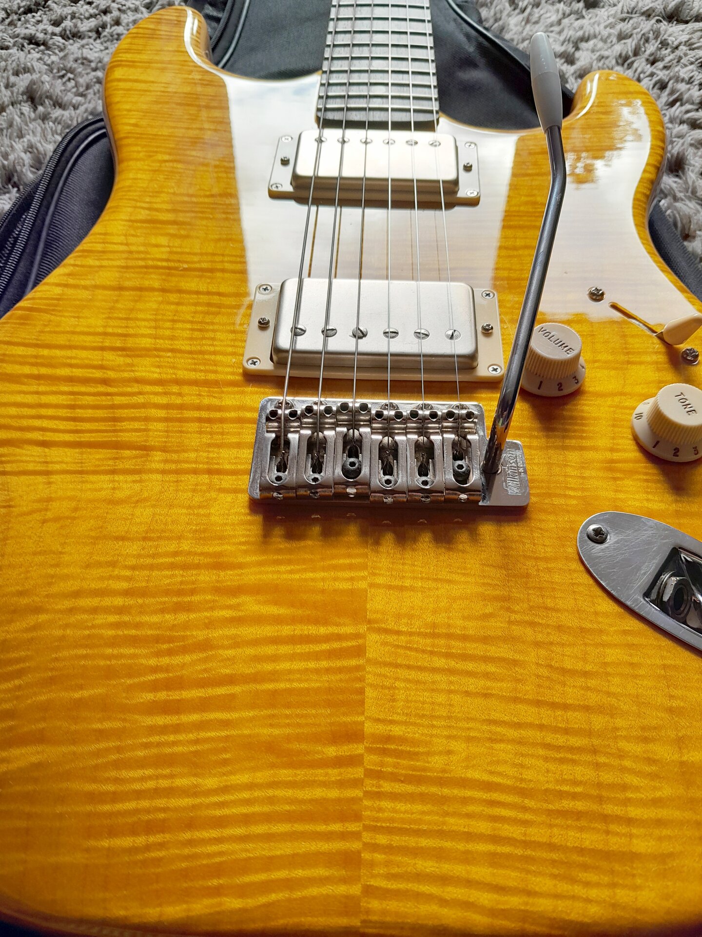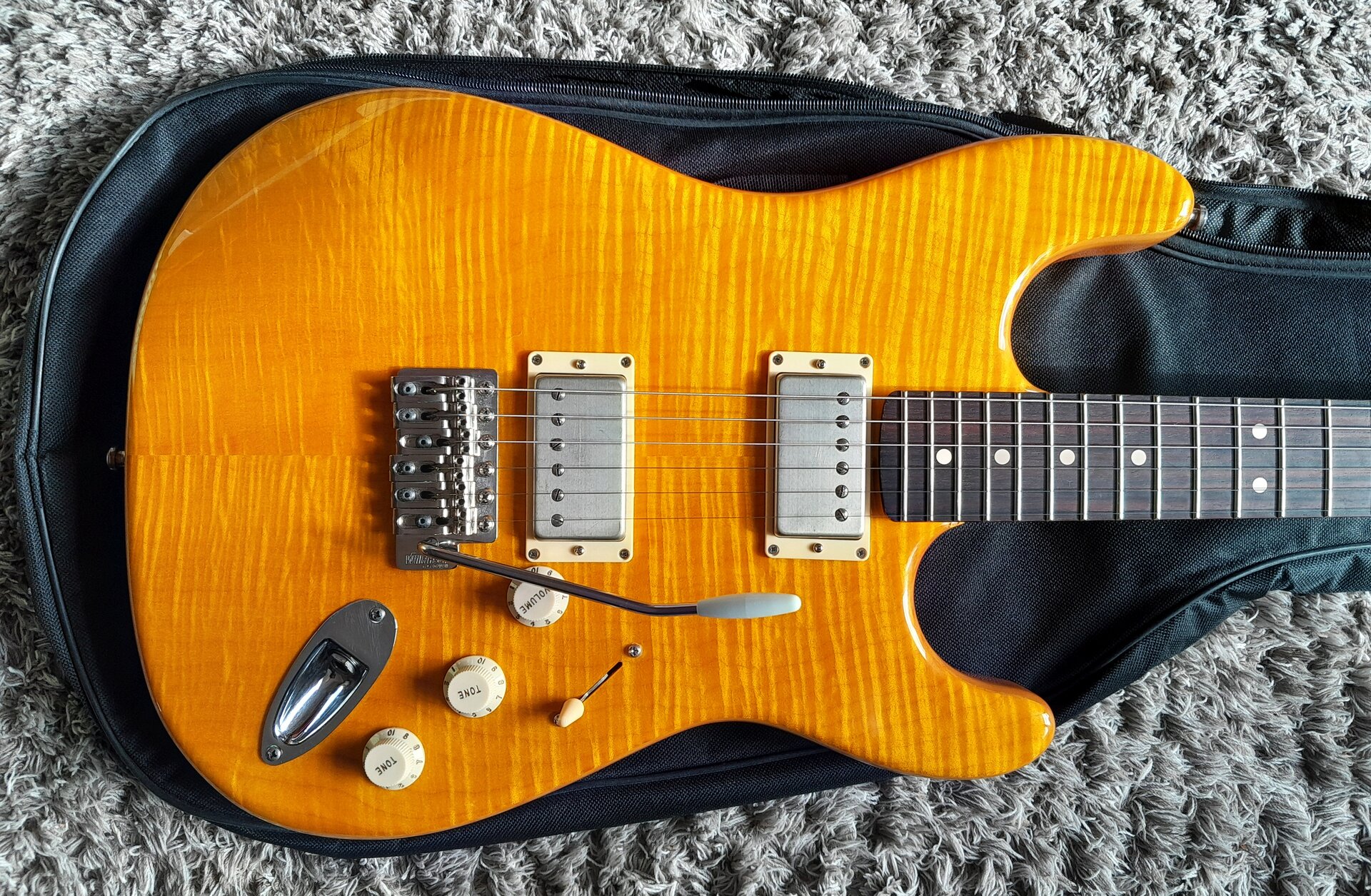 Leichter Warmoth-Body aus Erle mit AAA Flame Maple Top, der Body ist gelb lackiert, das Top aber ist transparent lackiert und gelb von Hand gebeizt(!), denn wenn man schon so viel Geld für ein massiv aufpreispflichtiges Unique-Choice-Top ausgibt (Scheiße, ich darf da nicht drüber nachdenken, Mannomann) dann will man, dass die Flammung geil 3D und optimal zur Geltung rüberkommt. Daher gebeizt.