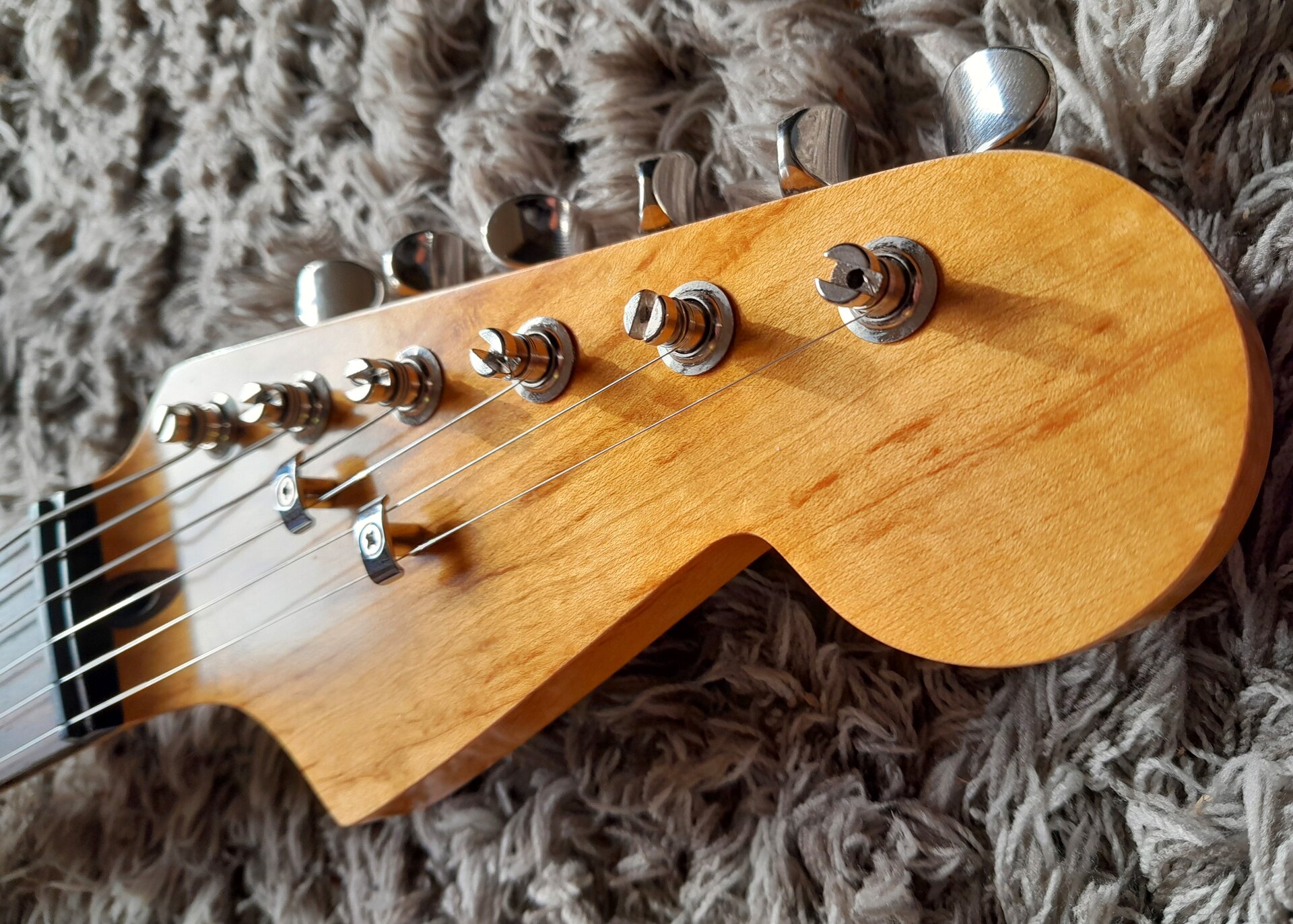 Warmoth Standard thin, Compound Radius 10-16, figured maple mit Rosewood Griffbrett,Bünde quasi noch perfekt, Sattel und Bünde abgerichtet beim Gitarrenbauer (Zupfinstrumentenmachmeisterin Pruscini in Hagen). Fender String Trees, 22 Medium Jumbo Dunlop 6150 Bünde.