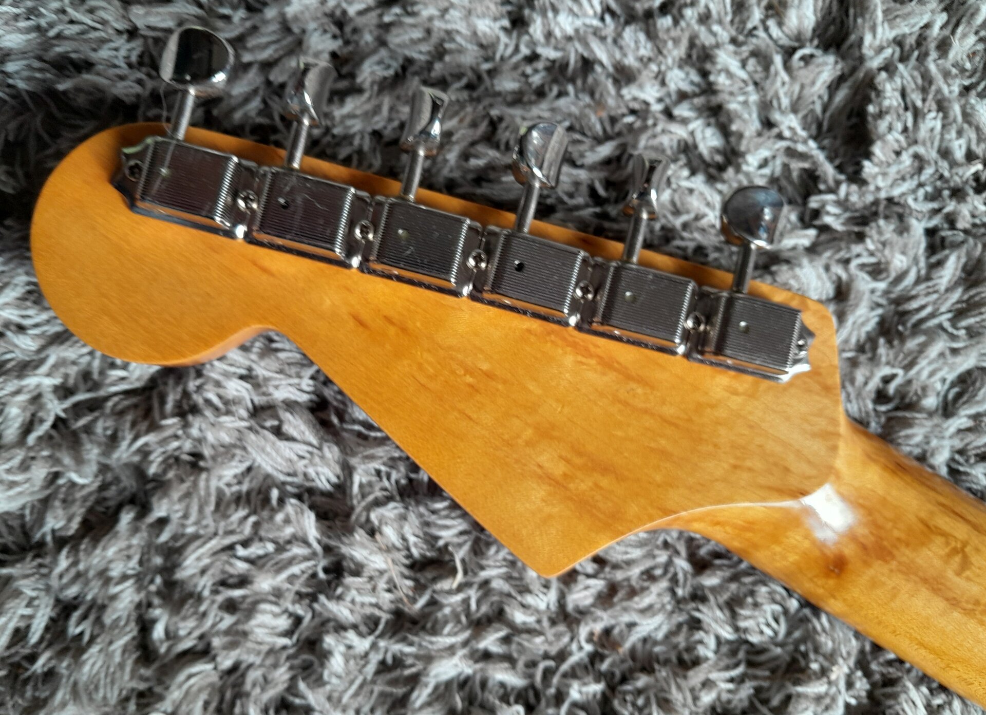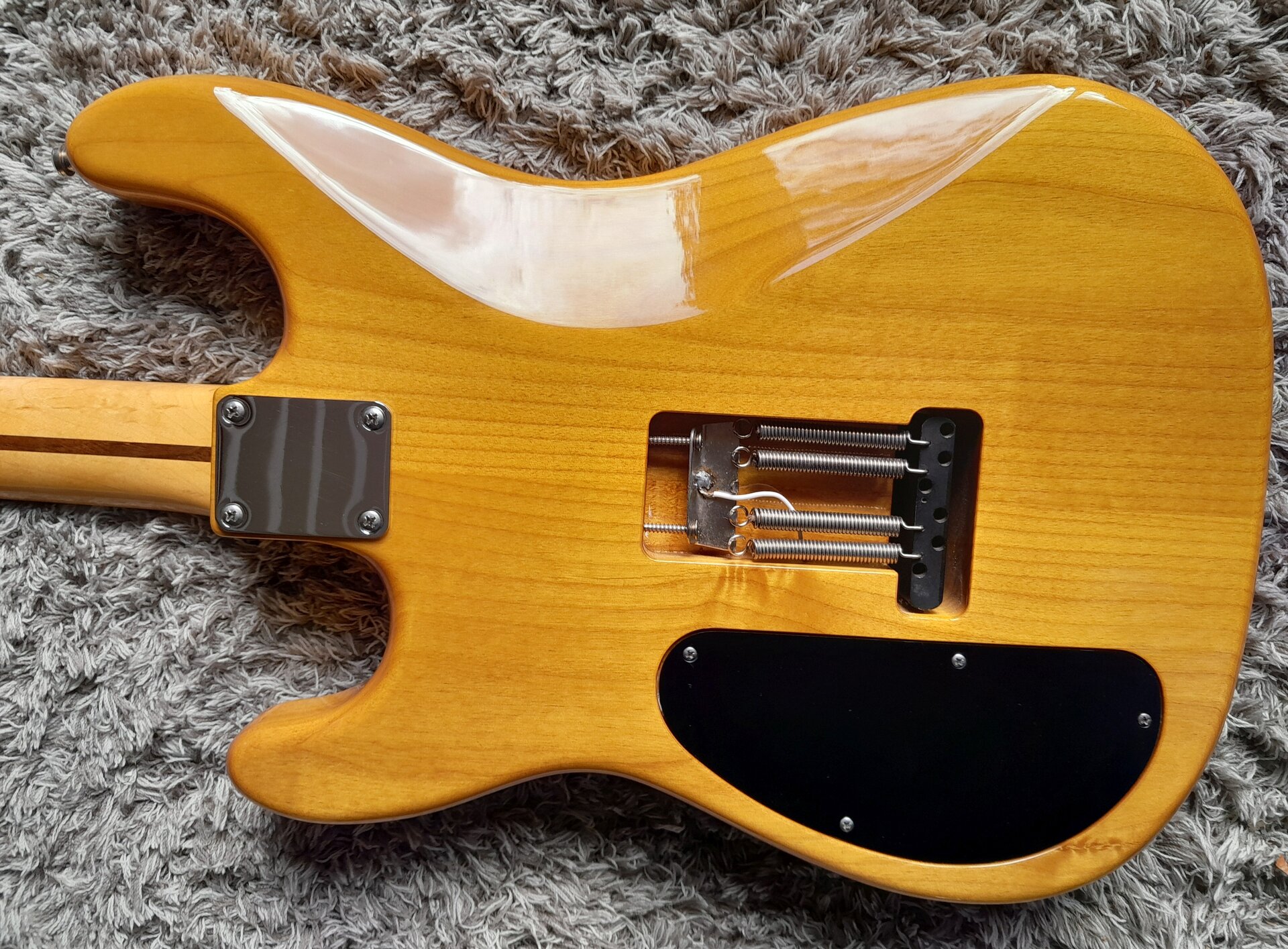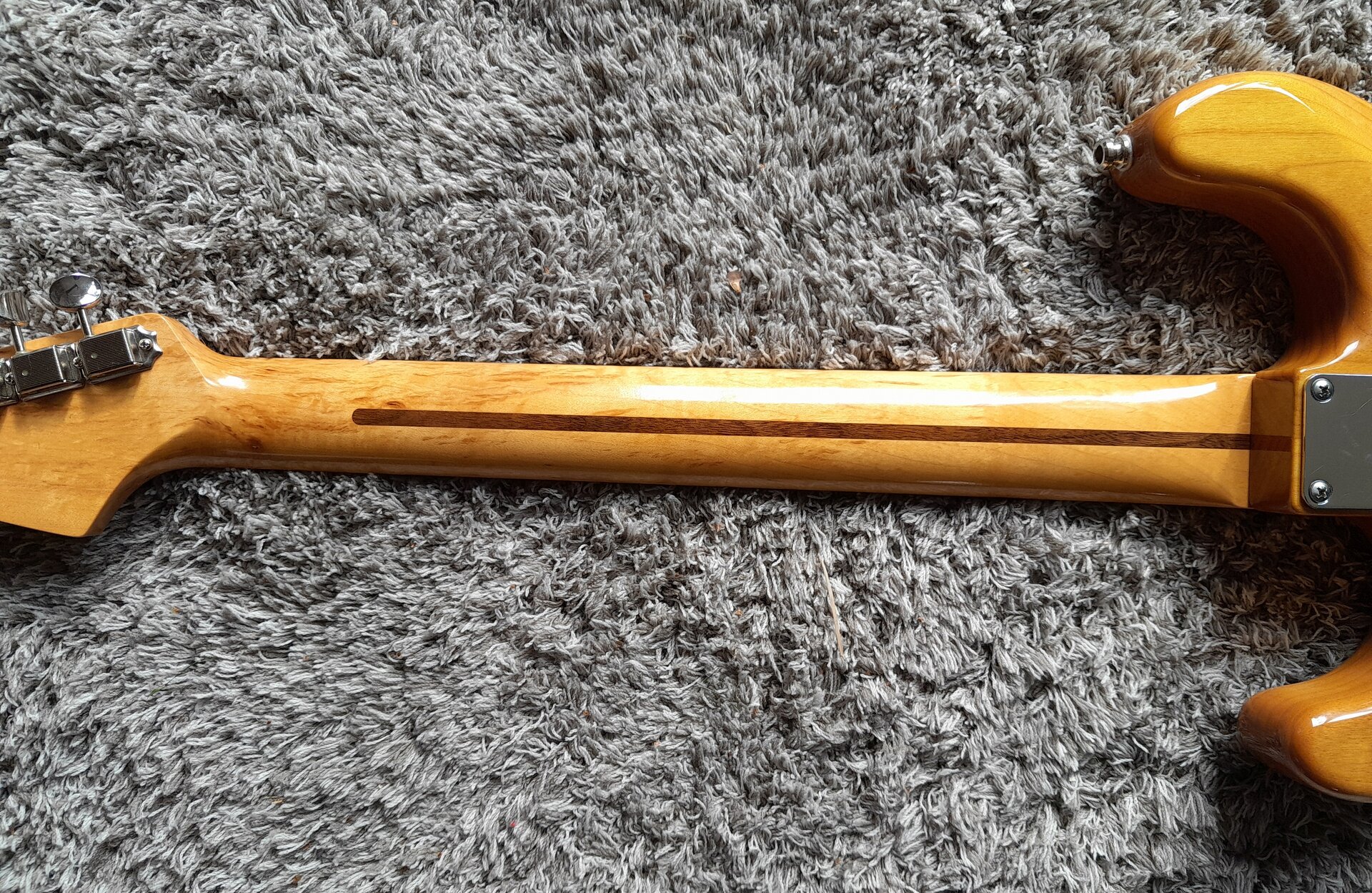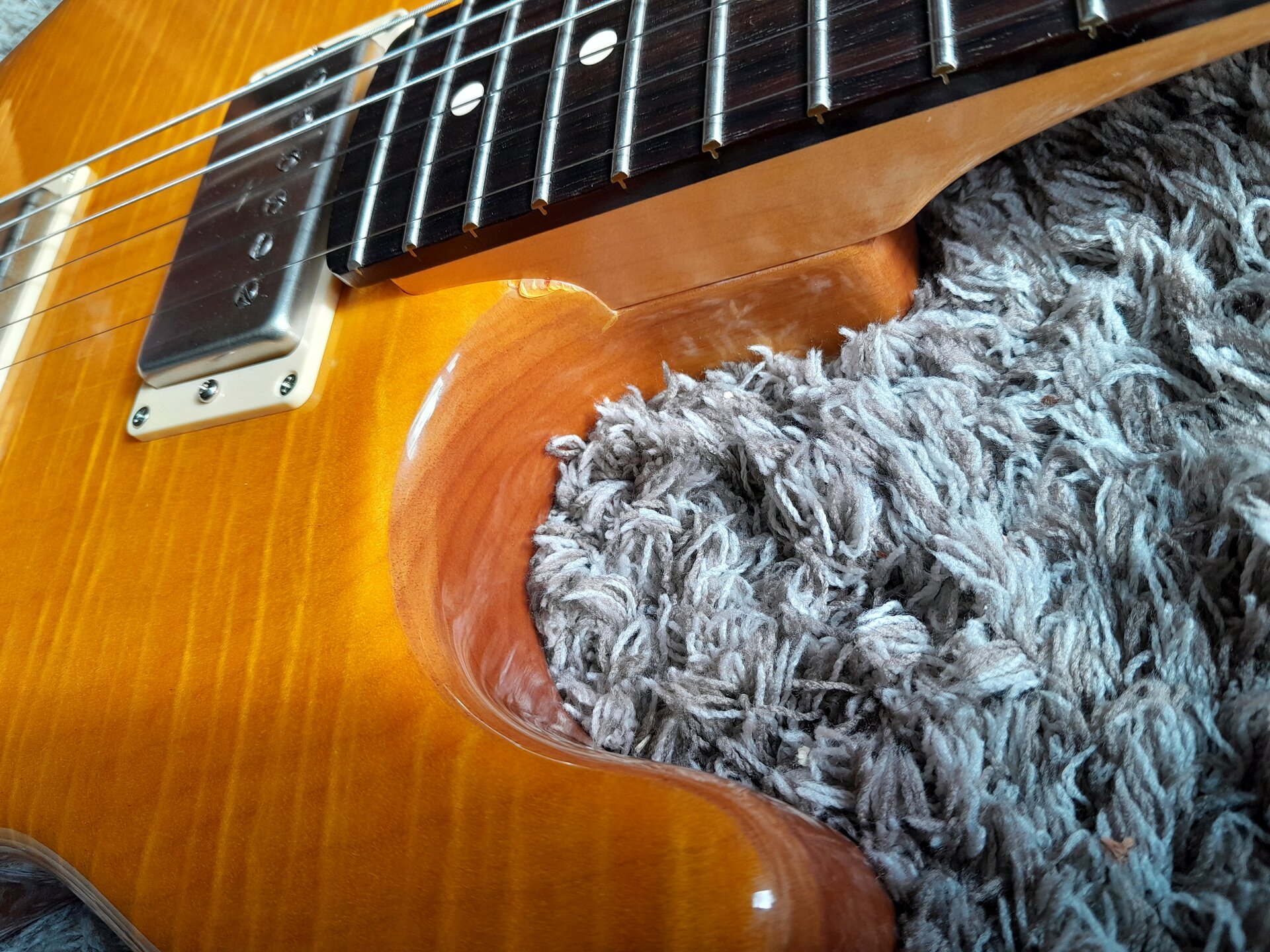 Einziges Manko dieses ansonsten perfekten und sauteuren Bodies ist eine Lack-Ecke an der Halstasche. Also in der Kurve des unteren Cutaways. Siehe Bild.