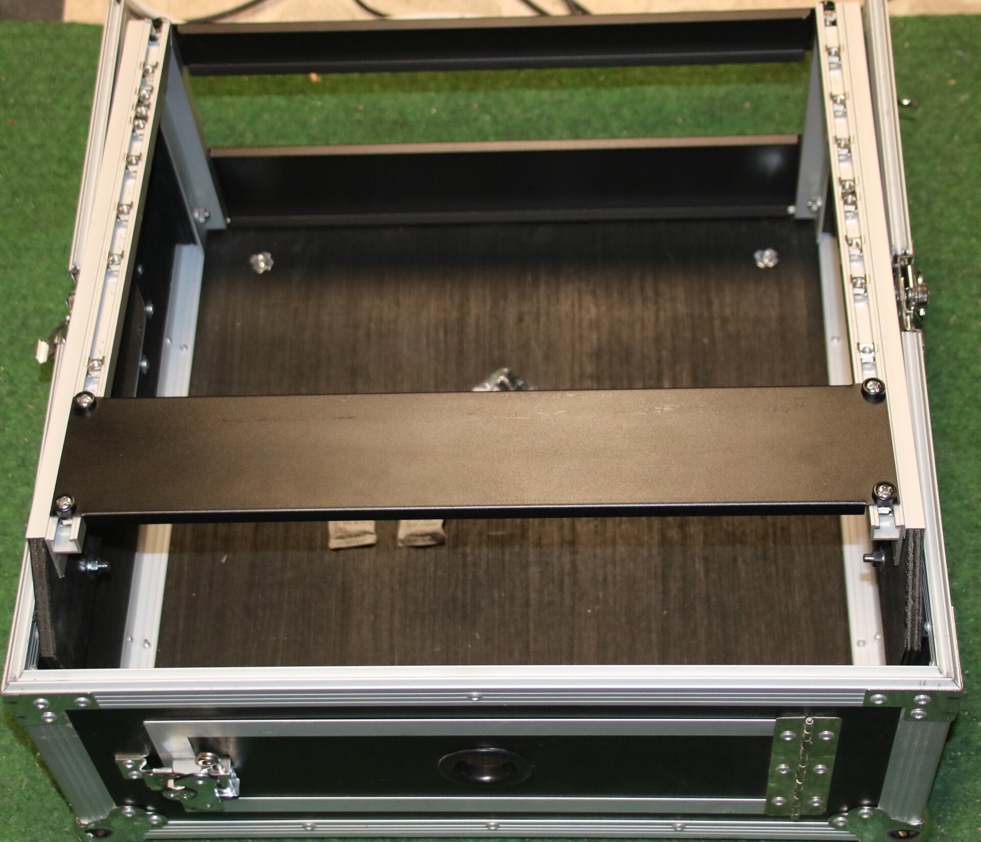 Durch die fest angeschrägten Rackschienen oben ist der Einsatz von Mischpulten ideal.