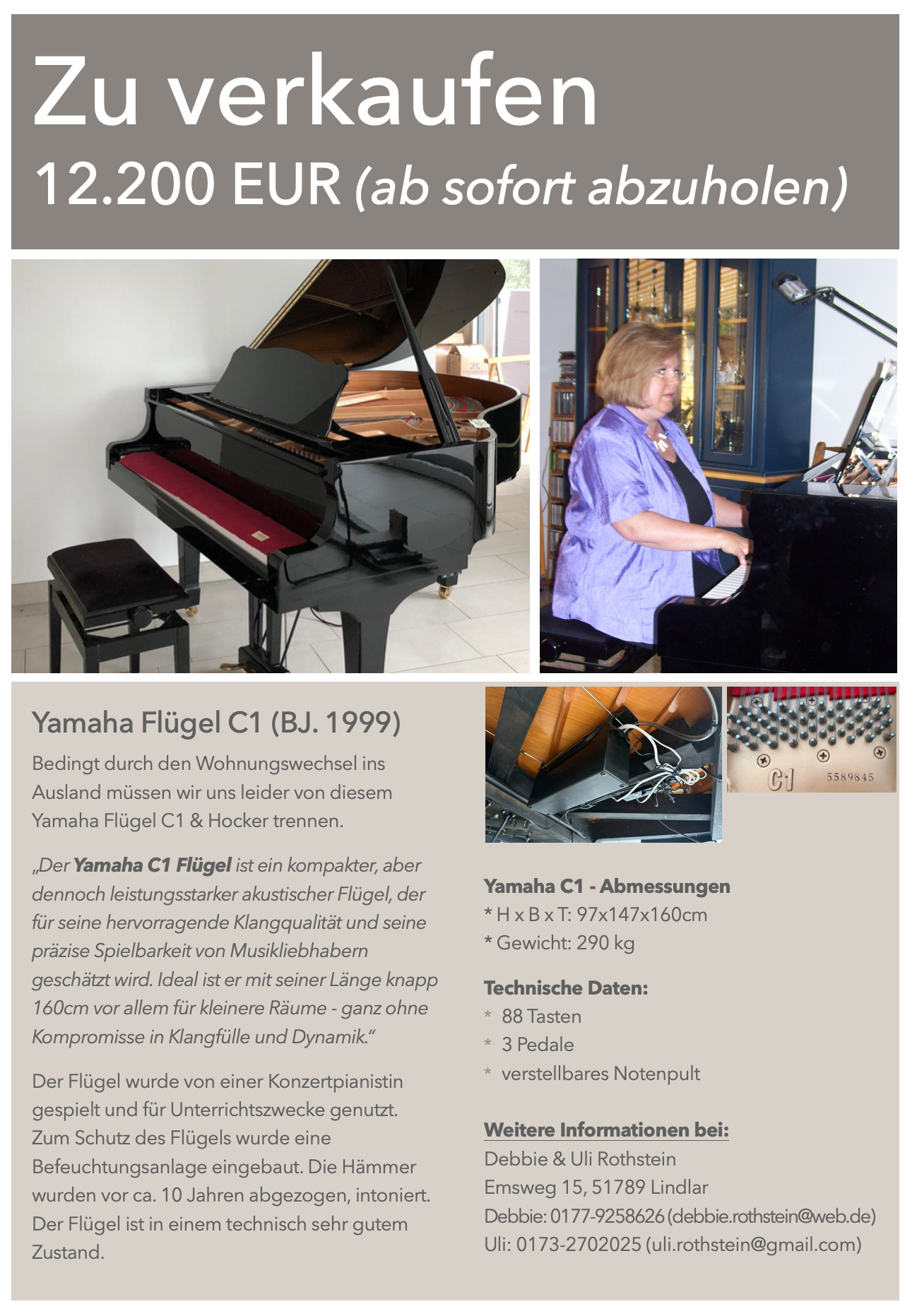 Bedingt durch den Wohnungswechsel ins Ausland müssen wir uns leider von diesem Yamaha Flügel C1 & Hocker trennen. „Der Yamaha C1 Flügel ist ein kompakter, aber dennoch leistungsstarker akustischer Flügel, der für seine hervorragende Klangqualität und seine präzise Spielbarkeit von Musikliebhabern geschätzt wird. Ideal ist er mit seiner Länge knapp 160cm vor allem für kleinere Räume - ganz ohne Kompromisse in Klangfülle und Dynamik."