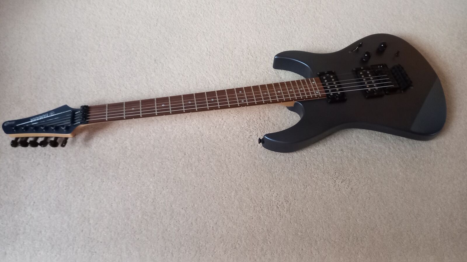 Anfang des Jahrtausends in Taiwan gebautes Instrument mit 670mm Mensur. Die leicht verlängerte Mensur macht es möglich, ohne grössere Umstellung der Greifhand von Standard in Richtung Bariton und wieder zurück zu wechseln. Bin Erstbesitzer und habe die Gitarre nicht mehr als 10 Minuten gespielt; sie kam allerdings mit leicht verformtem Unterbug inklusive Lackabplatzer, was aber nur kosmetisch ist. Das Projekt, in dem sie zum Einsatz kommen sollte, ist tot und wird nicht wiederbelebt.