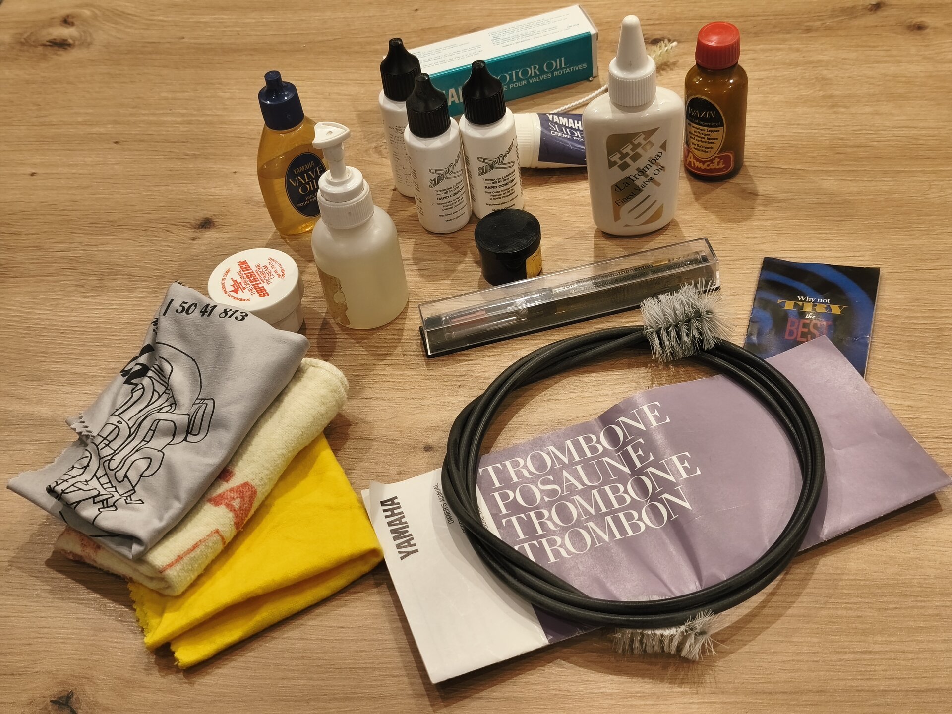 - Slide‑O‑Mix, Yamaha Valve Oil, Rotoröl, Zugfett