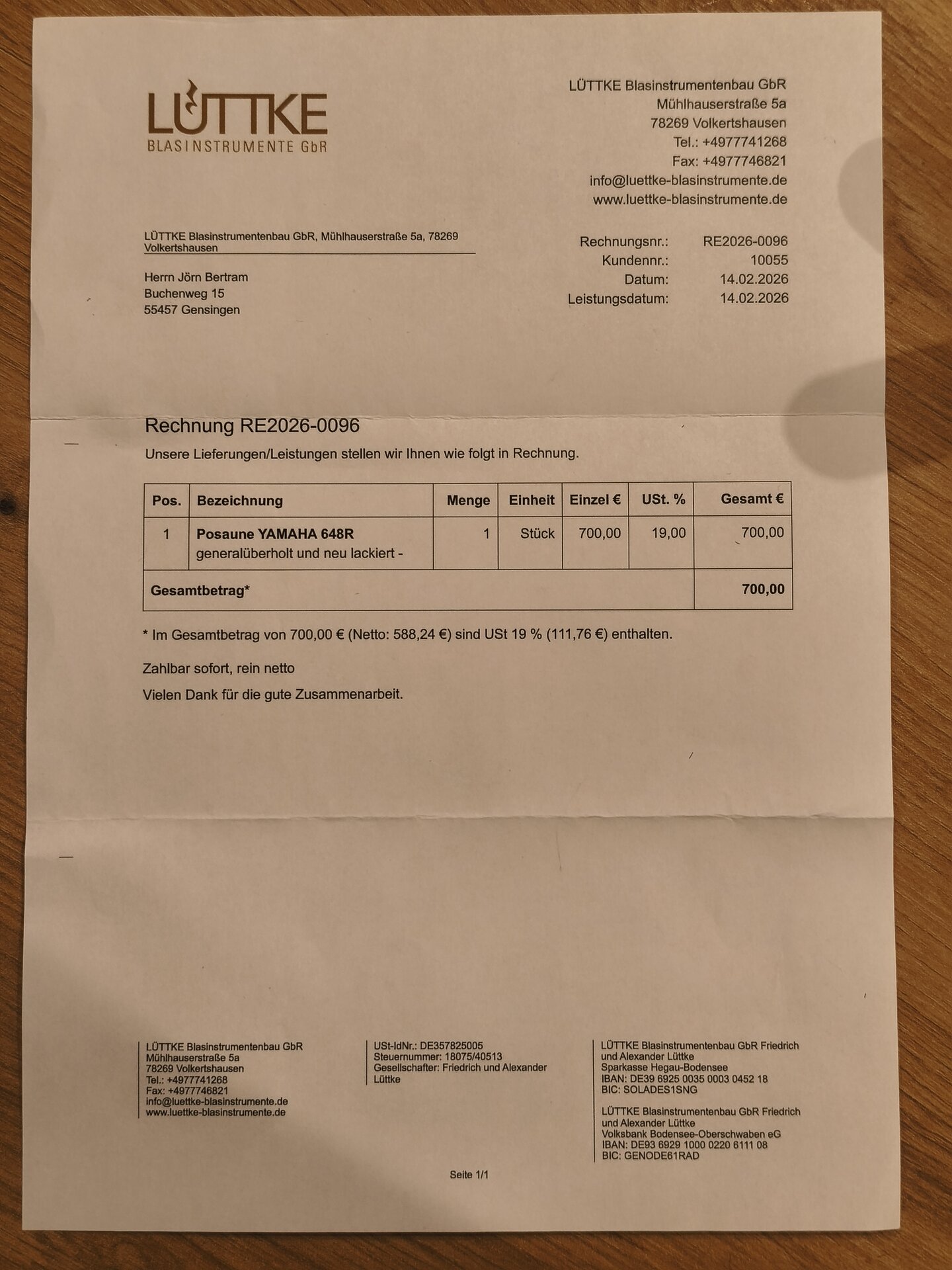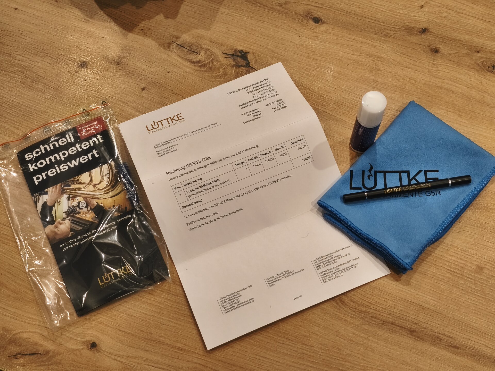 Das Instrument wurde im Februar 2026 bei Lüttke Blasinstrumentenbau für 700 € komplett generalüberholt und neu lackiert und befindet sich entsprechend in einem nahezu neuwertigen Zustand – technisch wie optisch.