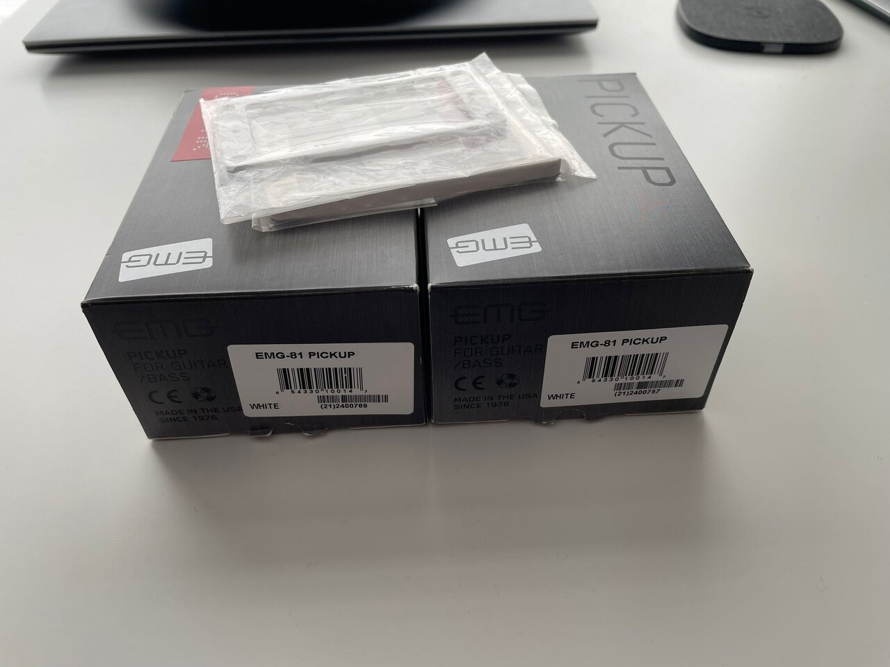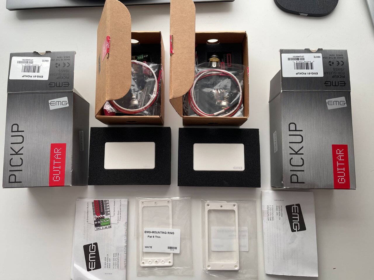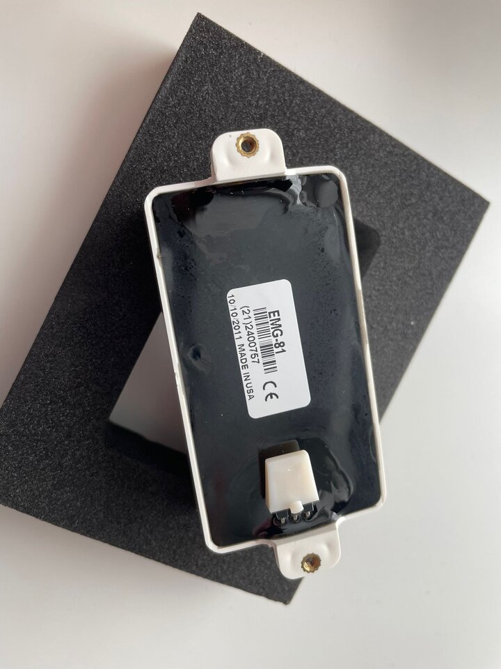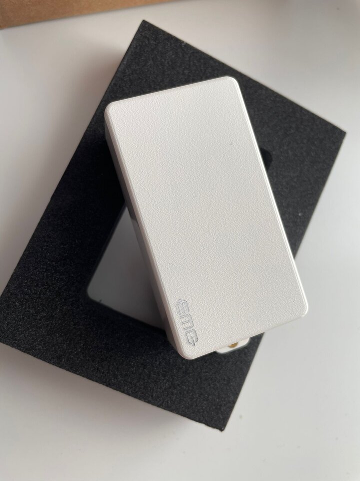 Ebenfalls gibt es noch zwei original EMG Einbaurahmen in weiss mit dazu, die bei den Pickups sonst nicht dabei sind.