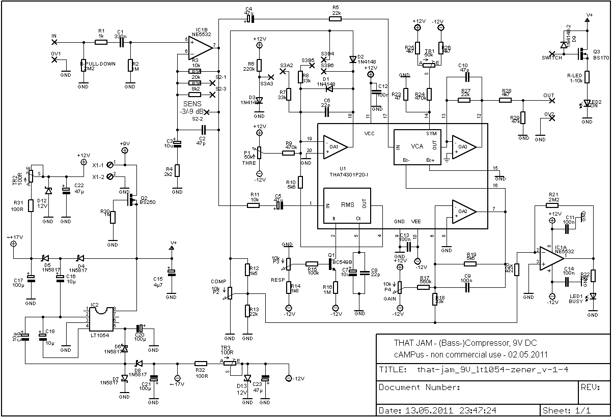 AK schaute sich die Design Notes von THAT (http://www.thatcorp.com/Design_Notes.shtml) sowie die Schaltung des Carl Martin Compressor Limiter ("CMCL") an und nach relativ kurzer Diskussion war geklärt, dass nur wenige Schaltungsmodifikationen für die Anwendung beim E-Bass vorzunehmen waren.