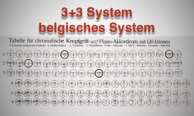 "120" musste bei seiner Suche feststellen, dass Informationen zum 3+3 System rar sind. Oft auch als "belgisches System" bezeichnet, liegt die Vermutung nah, dass es aus Belgien (August de Waele) stammt. Verwendet wird es aber eher im französischen Sprachraum Belgiens und den angrenzenden Departements in Nordfrankreich. In jedem Fall ist dieses System aber ein Außenseiter, obwohl es auch heute noch benutzt wird. Und sehr schöne Instrumente mit 3+3 gibt es auch noch, z.B. von Scandalli, Organola und Crucianelli. Jetzt lesen