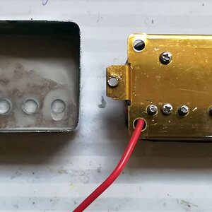 Ich habe die Lötstellen der Kappe erhitzt und mit der Entlötsaugpumpe abgesaugt und die Kappe vom Steg-Humbucker gezogen. In der Kappe ist ein Teil des geschmolzenen Parafins.