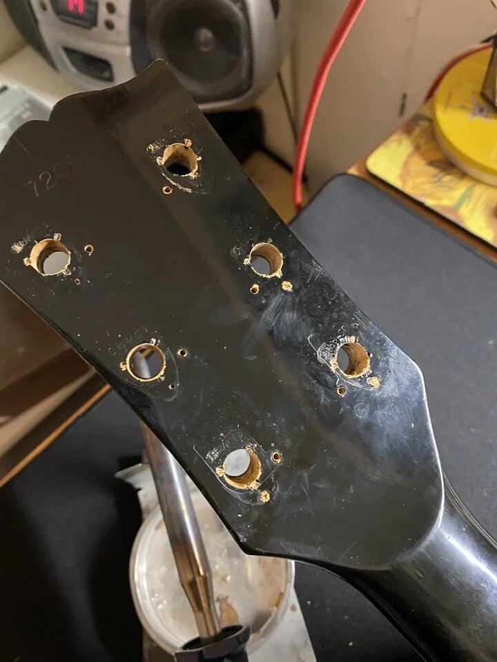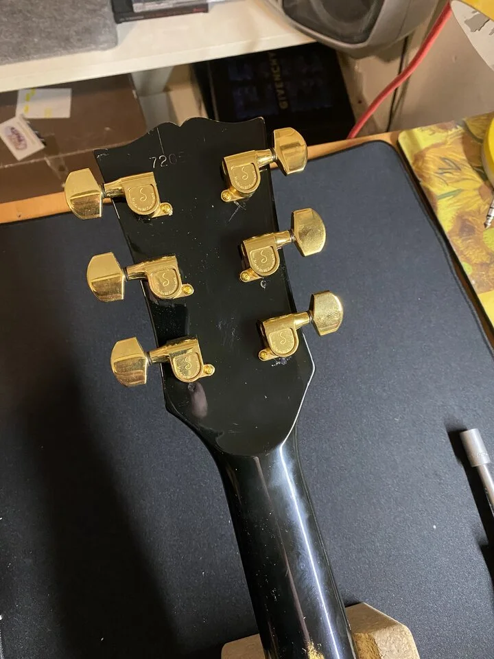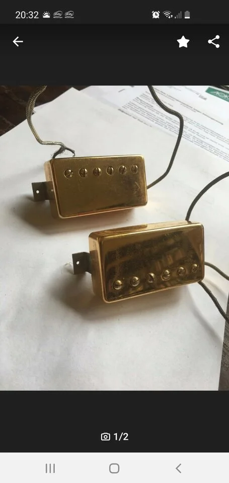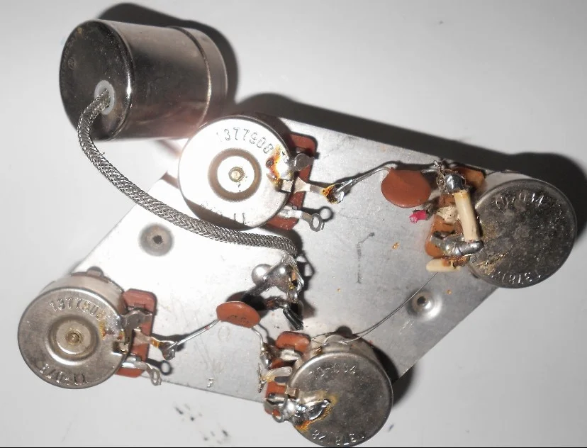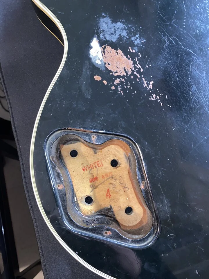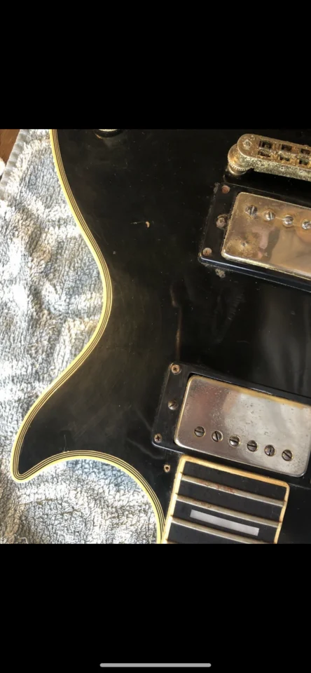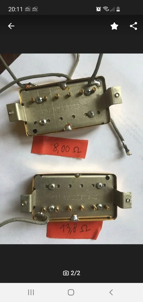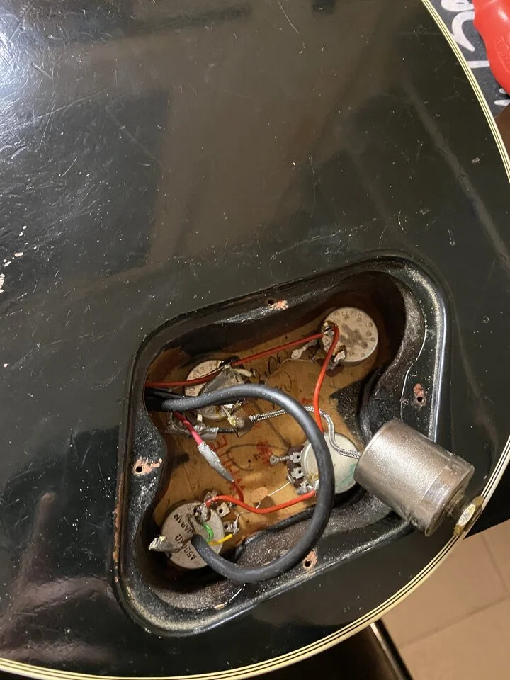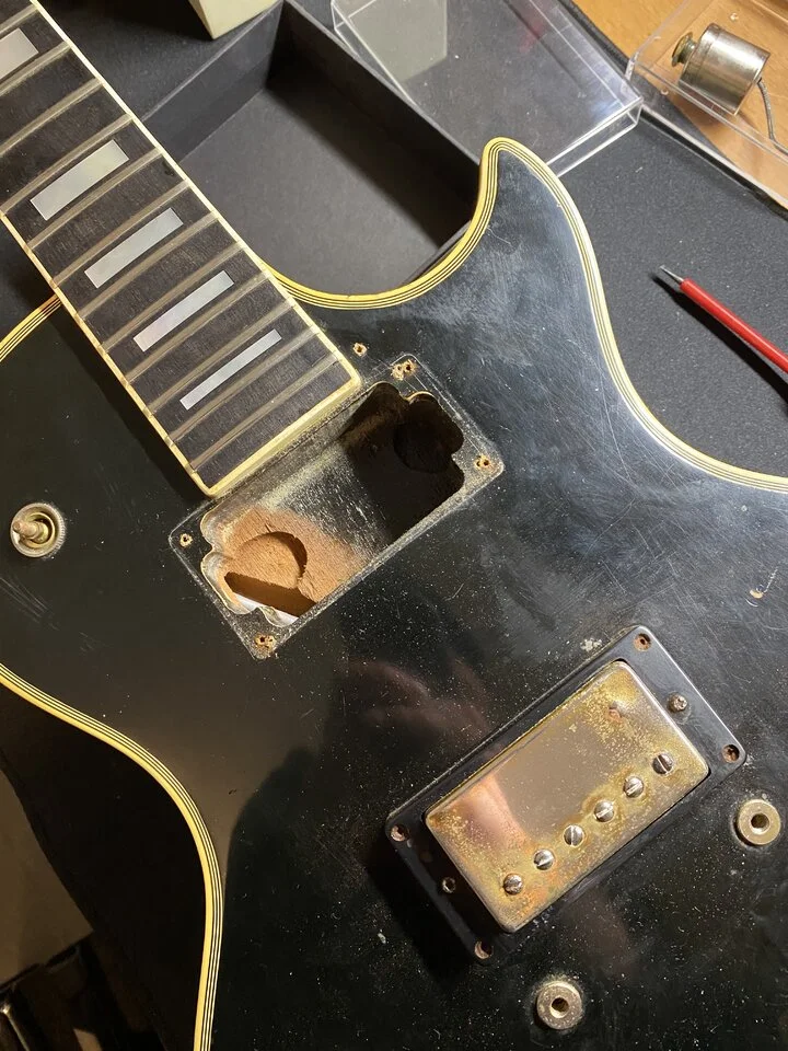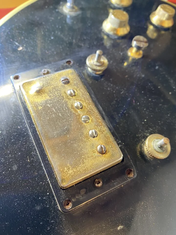 Leider fehlen mir ein paar Teile, wie die Original Potis samt Platte und Deckel (momentan ist eine Platte mit Potis aus einer 1992er Custom verbaut). Mir fehlt noch ein passendes Pickguard und die richtigen Humbucker. Momentan habe ich ein Set aus einer 1982er Custom drin, bin mir aber nicht sicher, ob es Tim Shaw Humbucker sind oder doch schon 490/498, wobei die ja eigentlich erst später kamen, allerdings fehlt auf ihnen der Datumsstempel. (Foto anbei)