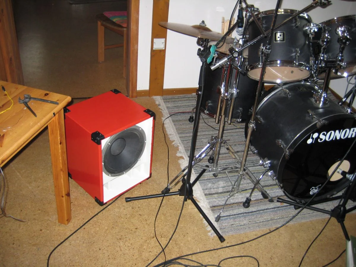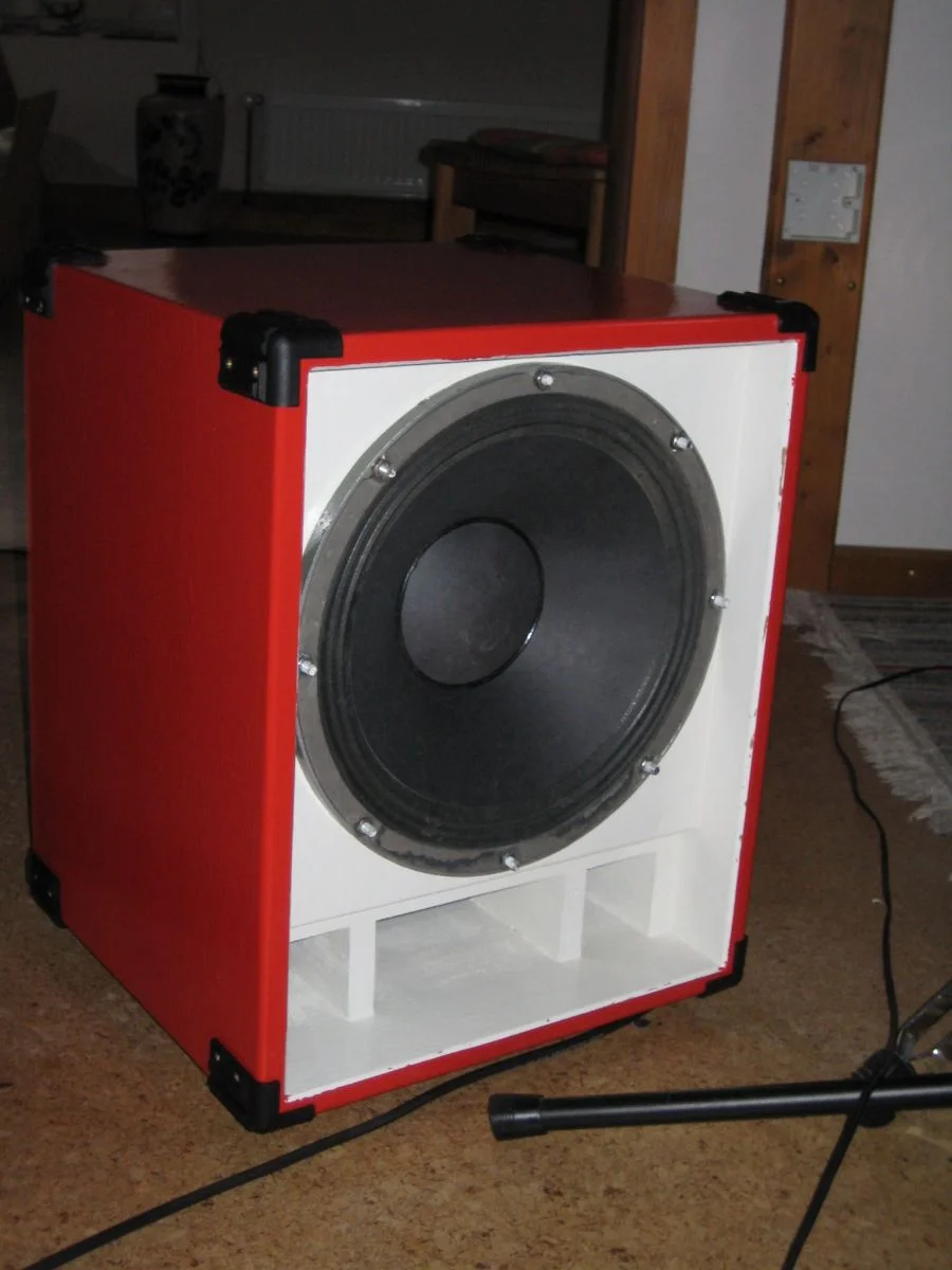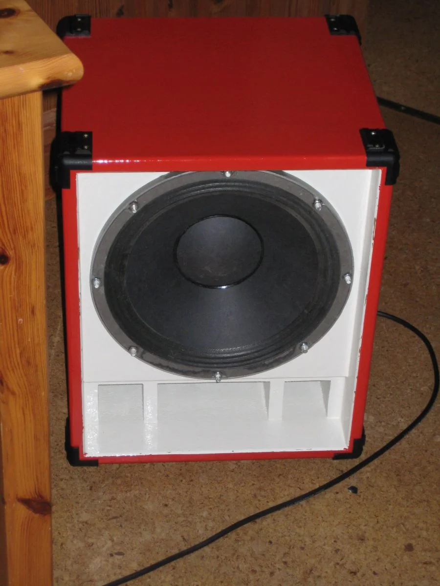 Herrausgekommen ist eine schöne, knallrote Anti-Vintage-Thiele mit super Sound für vergleichsweise kleines Geld (Material ca 25 + den Speaker). Arbeitszeit waren vielleicht so zwischen 10 und 15 Stunden. Den Sound finde ich einfach Wahnsinn für die kleinen Ausmaße, satte Bässe, dreckige Mitten und keine hässlichen Höhen. Es gibt noch die Möglichkeit die Bassreflexöffung teilweise zu verschließen (hab ich im ungestrichenen Zustand mal getestet), was noch mehr (und tiefere) Bässe bringt. Da ich die Bassistin in meiner Band aber nicht ganz überflüssig machen wollte hab ich mich jedoch entschlossen die Bassreflexöffung offen zu lassen. Belastbar ist der Speaker mit 200 Watt (sollte also auch dem übelstem Mörderamp standhalten) und hat 8 Ohm.