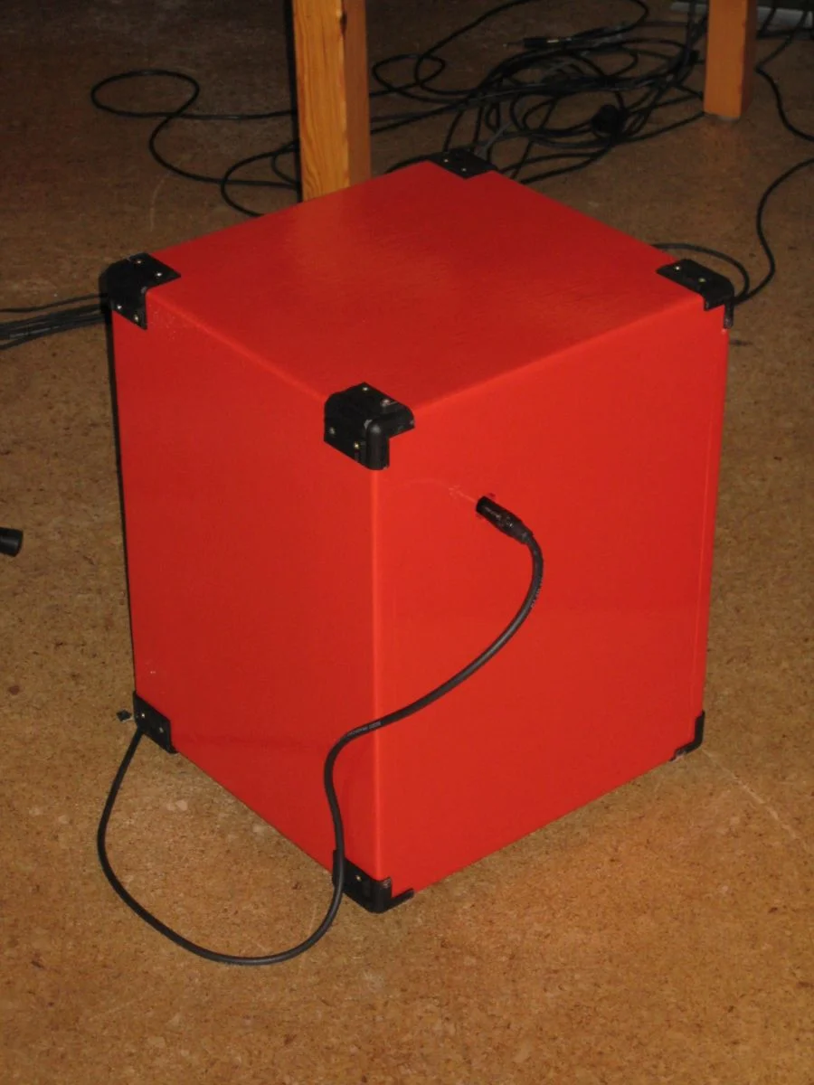 Die einzelnen Teile schnitt ich mit der Stichsäge aus den Leimholzplatten aus. Zunächst baute ich den Deckel, dann die Bodenplatte mit den Bassreflexöffungen zusammen. Als nächstes wurden dann diese beiden Teile über die Seitenteile miteinander verbunden. Dann wurde die Vorderseite mit dem Speaker eingesetzt, und schließlich die Rückseite. Ein kurzer Soundcheck bestätigte meine Soundvorstellungen voll und ganz. Die Anschlussbuchse wurde mit einem Metallblech an einem 20mm Loch in der Rückwand der Box befestigt. Als nächstes wurden alle Löcher der Schrauben (die immer gut versenkt wurden) verspachtelt und die ganze box wurde geschliffen. Dann begann ich die alten Farbreste an der Box zu verstreichen (mehrere Schichten). Da mir die weiße Farbe ausging musste ich noch rote nachkaufen. Auf diese Weise entstand auch die 2-Farbenlackierung. Schließlich wurden die Boxenecken und die Gummifüße montiert.