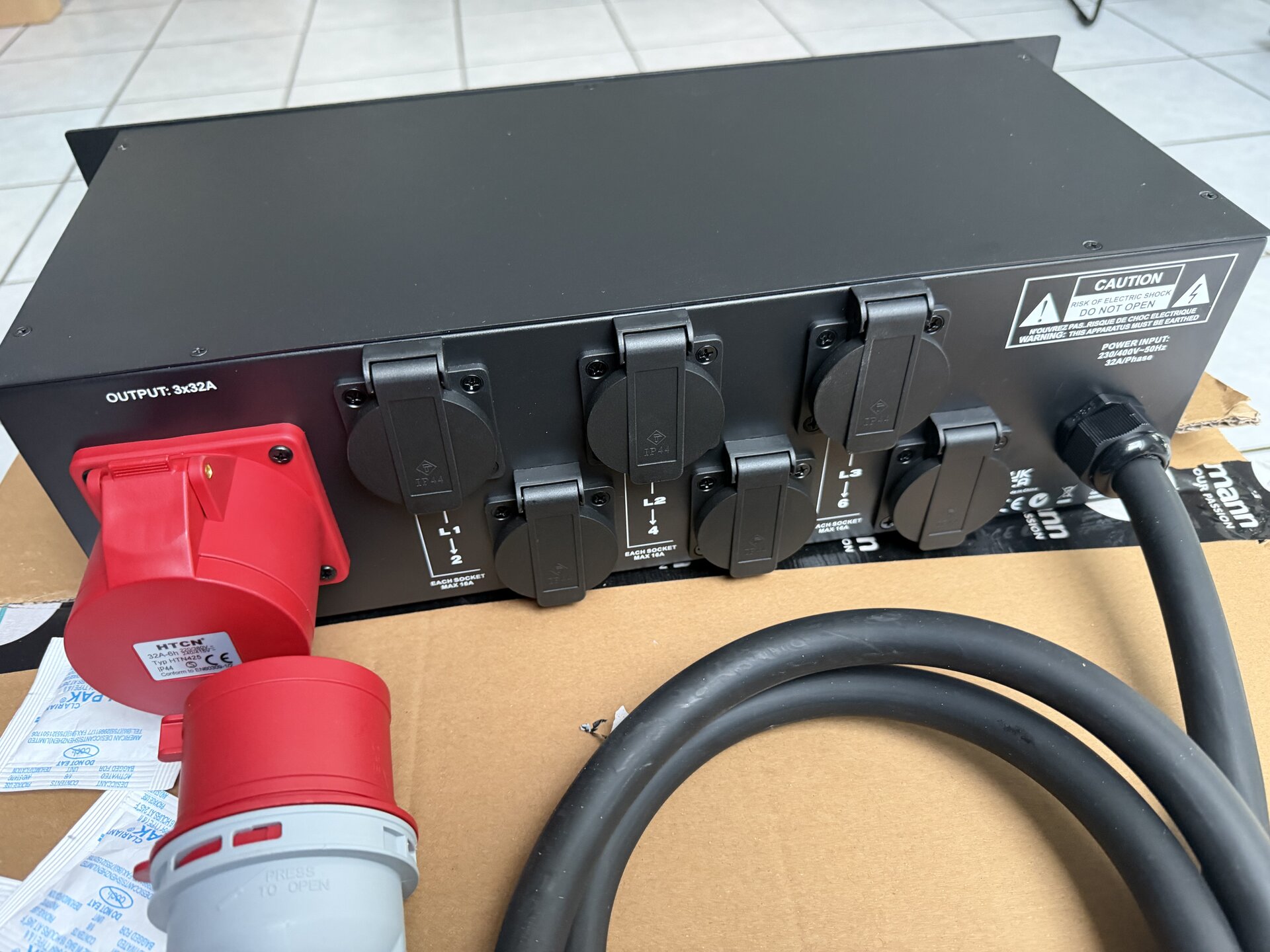 Der Verleih verlangte für Ton und Licht jeweils eine 32 A CEE Zuleitung. Prompt fanden wir beim Zelt einen Verteilerkasten mit 2x32 A und einem 16 A Anschluss, letzterer war für die Gastro gedacht, fein säuberlich von einem ortsansässigen Elektro-Installateur bereit gestellt.