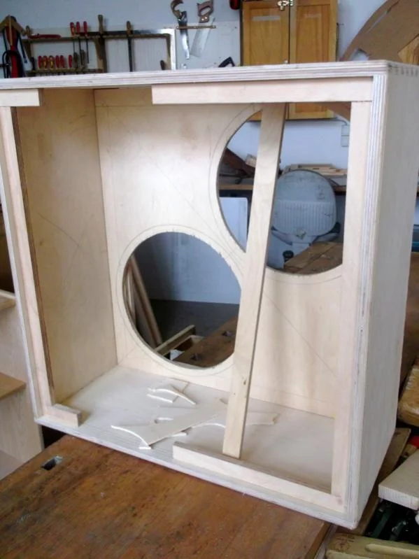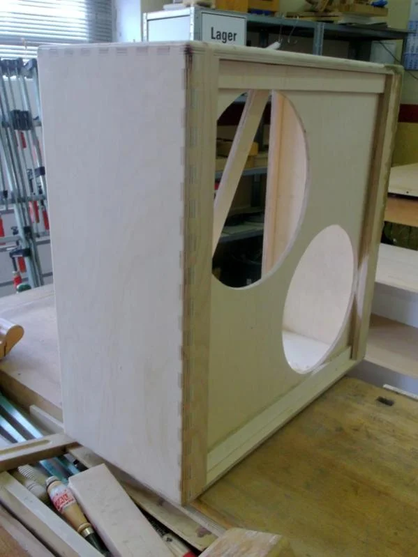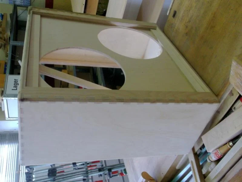 Das Gehäuse besteht aus 15mm Birken-Multiplex und wird später Schellack lackiert. Die Innenmaße (je nach Frontbaffle und Bespannrahmen sind ungefähr 570x570x230 mm.