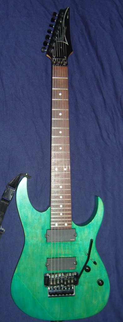 Hallo zusammen! Ich habe nun auch den Weg zu den 7 Saiten gefunden. Ich habe mir Anfang August eine gebrauchte RG7620 gekauft, die schon einige Macken im Lack hatte und zudem einen EMG707tw an der Brücke eingebaut hatte. Da mir die Farbe so gar nicht getaugt hat, habe ich den Body abgeschliffen und mit Wudtone-Finish behandelt (azure lagoon). (...)
