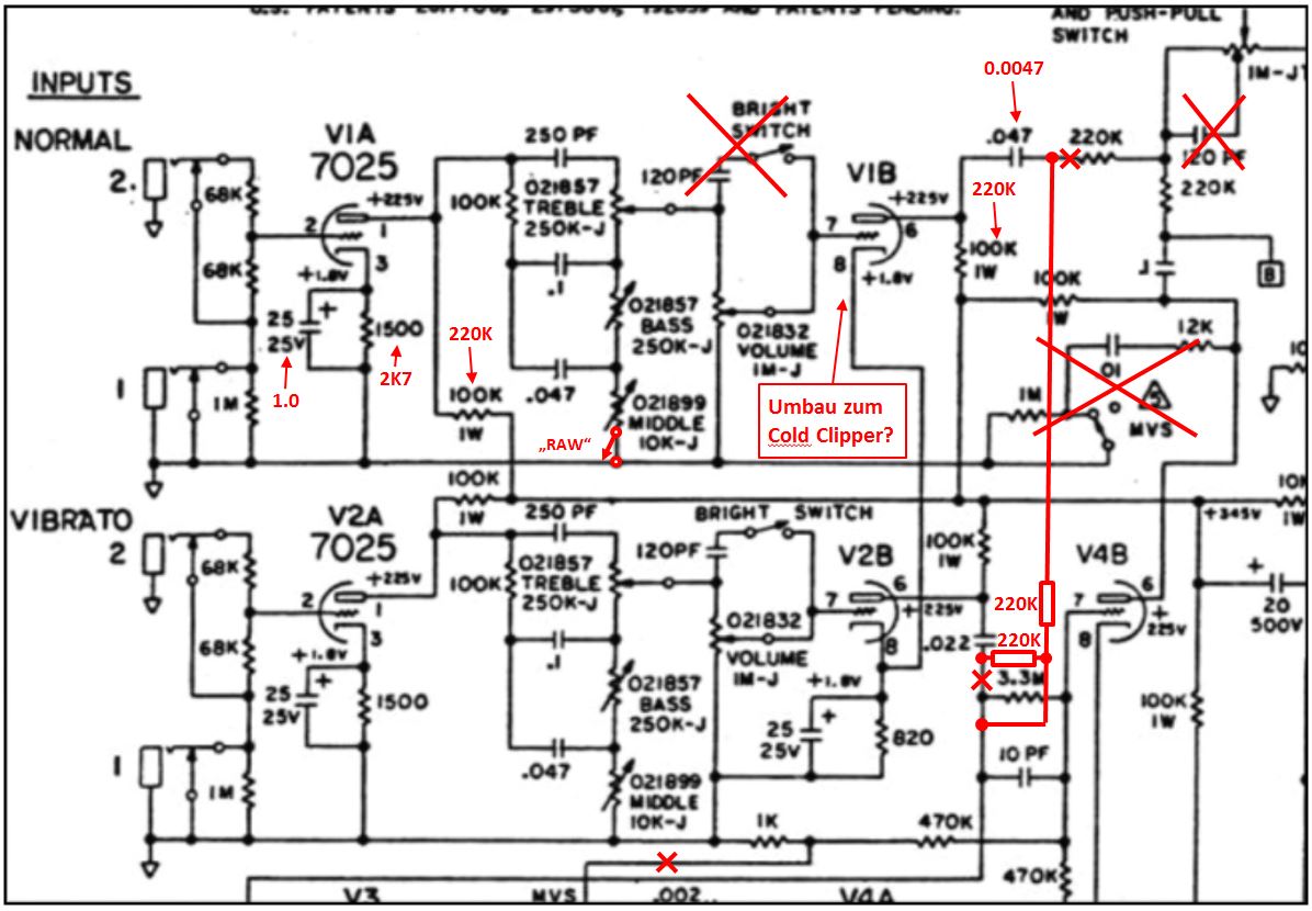 Einfach nur V1B zum Cold Clipper umzubauen (Kathodenwiderstand 5-10 k, kein Bypass-Kondensator) wird nicht reichen. Der Pegel hinter dem Tone Stack ist einfach zu niedrig um da irgendetwas in die Zerre zu treiben, der Amp wird dadurch nur viel leiser. Wenn du den Tone Stack überbrückst würde es gehen. Oder du schiebst den Tone Stack hinter V1B, dann wird der Amp aber auch leiser. Ob das V4a Mod das ausgleichen kann, gucke ich mir noch an. Habe das gerade kurz in LTspice simuliert.Um die Diskussion vielleicht noch mal etwas anzufeuern, hier meine durchgeführten Mods im Bereich der Vorstufe. Die Endstufe ist wie gesagt auf AB 763 Specs.