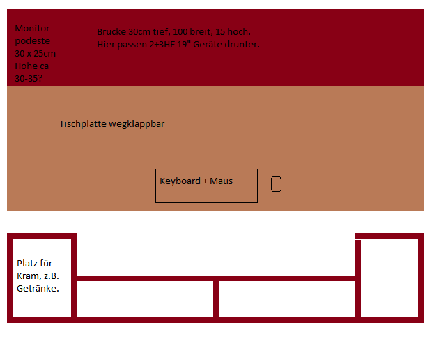 Da mein kleines Homestudio sowieso schon recht klein ist (3,75x3,85m) und gleichzeitig ein Proberaum mit Schlagzeug, Gitarrenamps etc. ist, will ich da auch maximal nur eine 150x75cm große Tischfläche für meinen Arbeitsplatz reinstellen - und selbst da werd´ ich wohl die Tischplatte mit Scharnieren an der Wand befestigen damit ich den Tisch ggf. an der Wand einklappen und die Füße abschrauben kann
