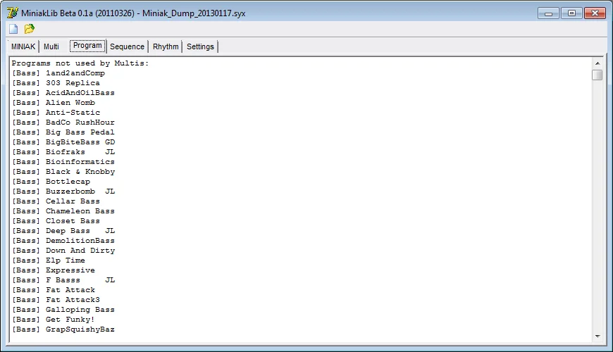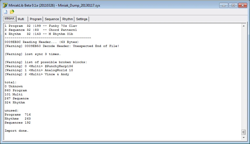 Ich bräuchte aber mal bei einer Sache eure Hilfe, wie bekomme ich denn die Sounds des Ion in den Miniak? Ich habe hier noch die Red, Green, Blue und User Sysex Soundbänke vom Ion und würde die gerne in den Miniak übertragen, die beiden sollen ja Patch kompatibel sein, nur wie bekomm ich die da rein, also klar über Midi mit Cubase, MidiOX usw. aber wie sind die denn dann im Miniak angeordnet, Red, Blue usw. gibts da ja nicht, ich will mir das Miniak OS nicht bei einem Versuch zerschießen und deshalb frage ich euch mal lieber vorab. Hat das schonmal jemand probiert und weiß vielleicht Rat?