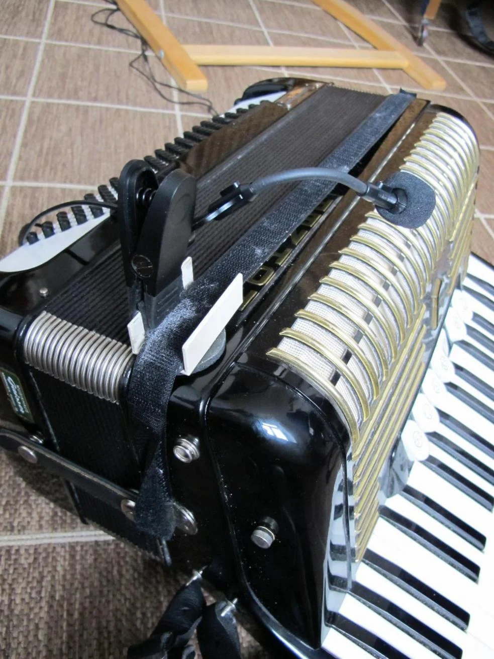 Wir nehmen am Berliner Ensemble und am Deutschen Theater die Mke2 und tapen sie an den Bassriemen bzw. in die Mitte des Diskantverdecks. Die Sender werden dann unten am Bassriemen bzw. am rechten Ridmen getapt.