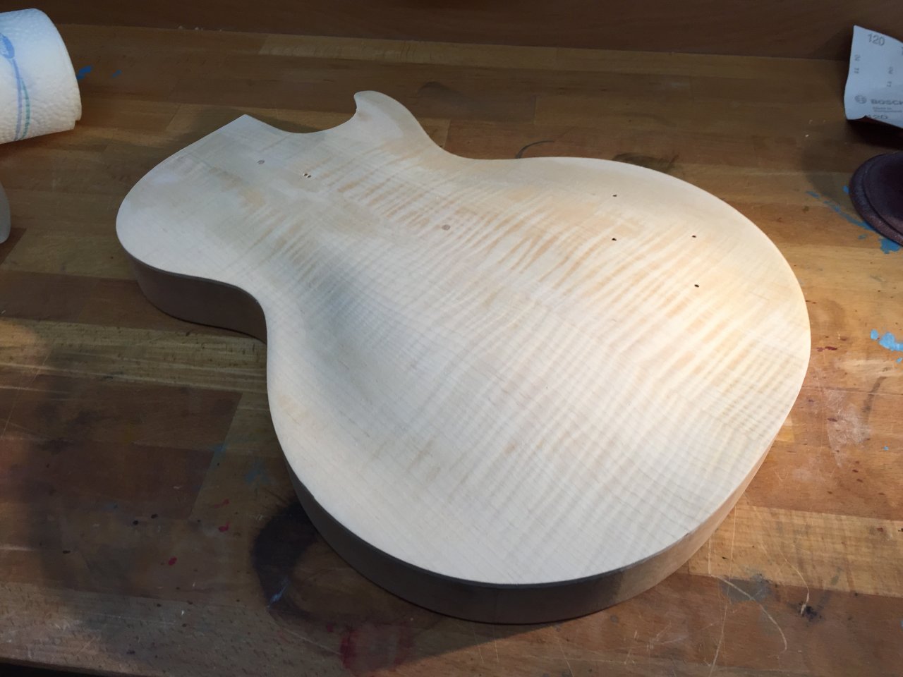 Die Decke ist an den dünnsten Stellen immer noch 3-4mm dick anstatt 5mm. Das dürfte kein Problem sein. Bei den alten Bursts waren die Decken auch nicht alle gleich dick. Ich arbeite ja nach den Bartlett-Plänen und das sind im Prinzip auch nur Richtwerte. Trotzdem merkt man natürlich bei vielen Arbeitsschritten Dinge, die man beim nächsten mal anders machen würde.