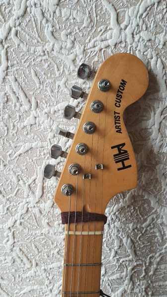 habe ich mal ein paar Bilderchen zu der merkwürdig gebrandeten Strat gemacht. Es scheint relativ sicher zu sein, dass sie von Dyna Gakki hergestellt wurde (praktisch baugleich zu JooDee-Instrumenten dieser Bauart, das war auch bei den Paulas so), aber ich rätsele nach wie vor an der Marke herum. Ich suche nach HHW oder HWH, naheliegend ist wohl der deutsche Raum, dort sind zumindest die 3 Instrumente aufgetaucht, von denen ich bisher Kenntnis habe.