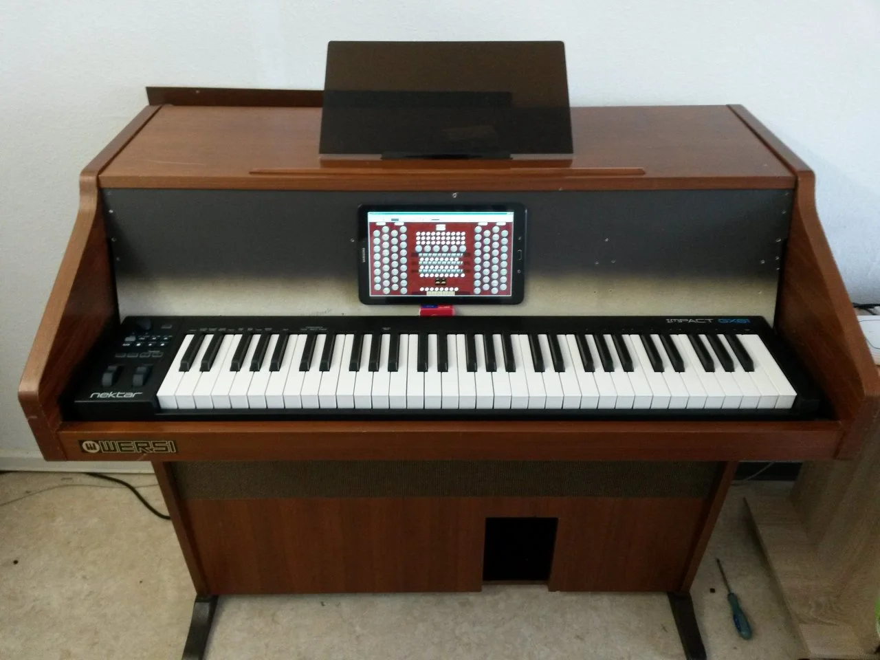 Gekostet hat das ganze bis jetzt rund 200 Euro. Wersi geschenkt, Midi Keyboard 88 Euro, Pedal inkl. Modifizierung 99 Euro. Display und Mainboard waren vorhanden. Der Rest Material wie Holz und so weiter. Orgelbank weiß ich aktuell noch nicht.