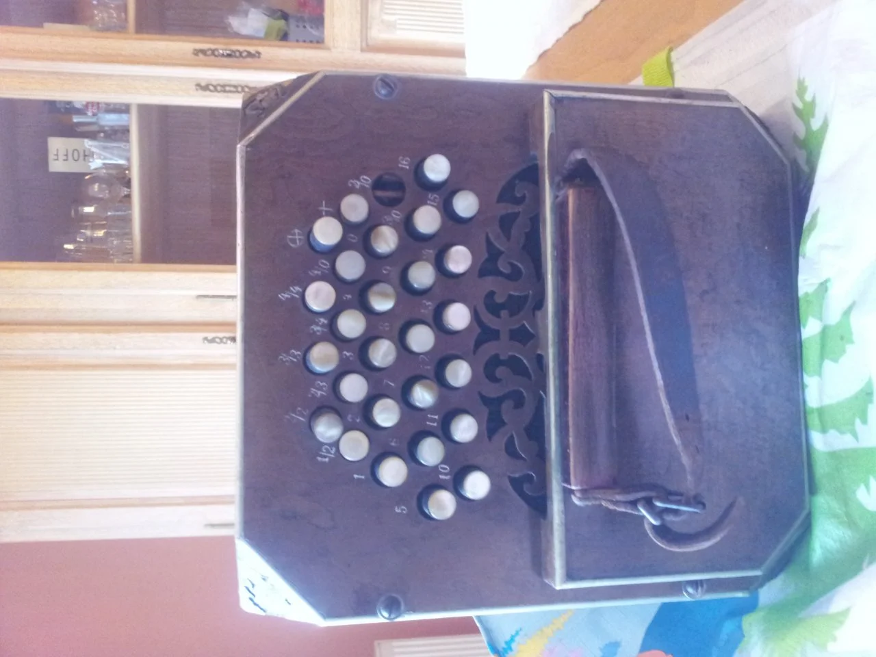 Meine suche hat ergeben, dass es ein Bandonion Carlsfeld 142 AA ll/ll ist, zumindest sieht es so aus. Die Tasten sind aus Perlmutt. Falls weitere Fragen zu dem Instrument bestehen bitte fragen 🙂.