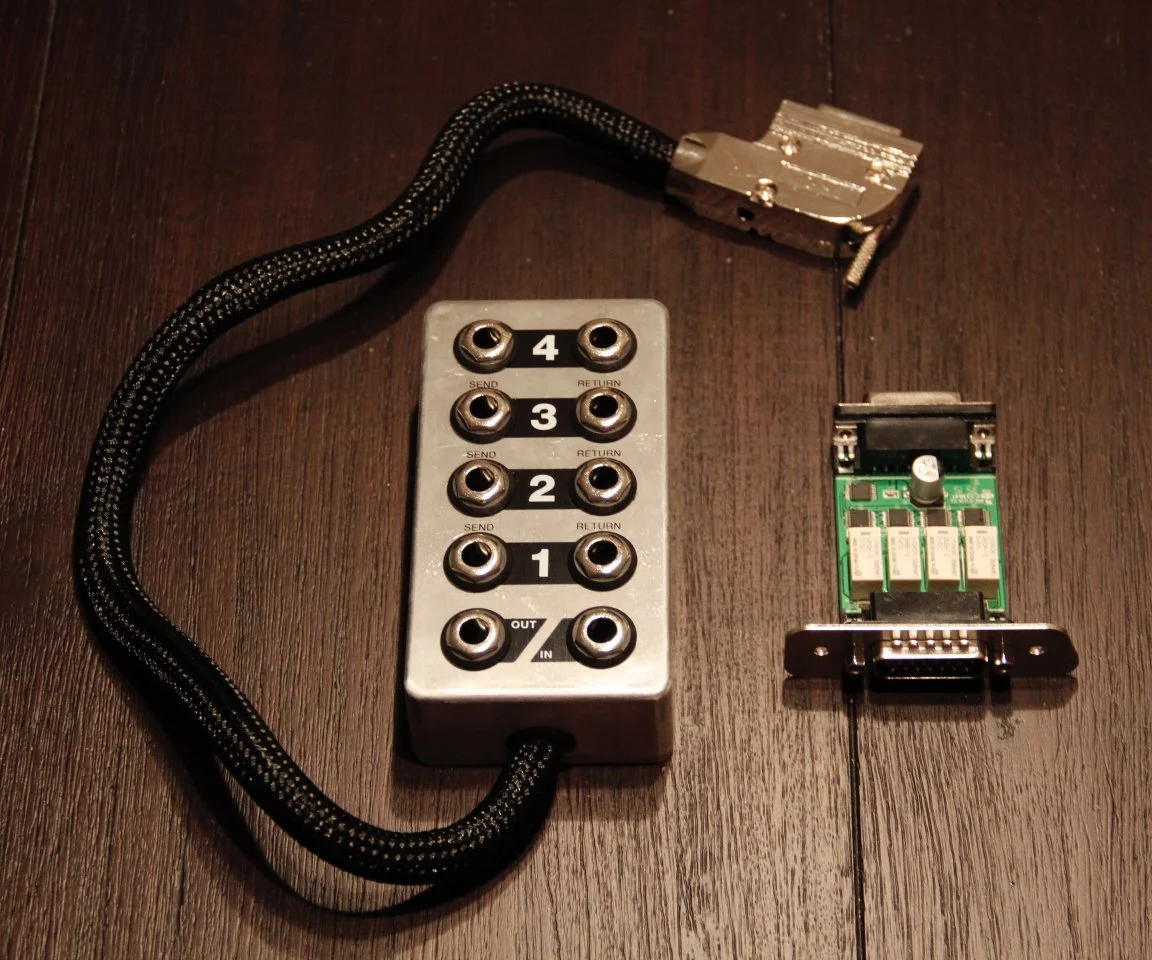 Nun kommt das nächste geniale Teil dieses Gitarrensystems ins Spiel: Das Looper Kit. Die Platine (rechts im Bild) wird seitlich in die Remote1 eingebaut und beinhaltet vier loops, die separat geschaltet werden können und zwar von der Remote1. Die Box (links auf dem Bild) wird dann an die eingebaute Platine angeschlossen und man kann per Patchkabel nach Herzenslust Pedale integrieren. Je nach Verkabelung kann man diese Loops komplett vor den Eingang des Amp1 oder komplett in den Effektweg des Amp1 legen. Sehr Cool!