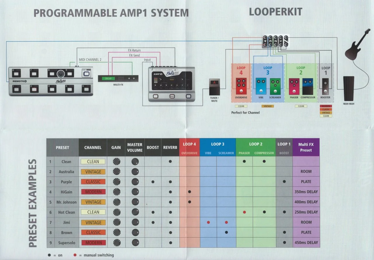 Verkabelt man das Looper Kit mit dem Effektweg des Amp1 geht das dann genauso gut mit Modulations- und Delay-/ Reverb-Pedalen. Folglich kann ich auf Preset 1 meinen Cleankanal mit Loop 1, in dem sich ein Chorus befindet, und auf Preset 2 meinen Leadkanal mit Loop 2 und dem Delay speichern. Und für die ganz verrückten unter uns, auf Preset 3 liegt dann ein Crunchsound mit Loop 1 und Loop 2 ( also Chorus und Delay). Yeah Baby!