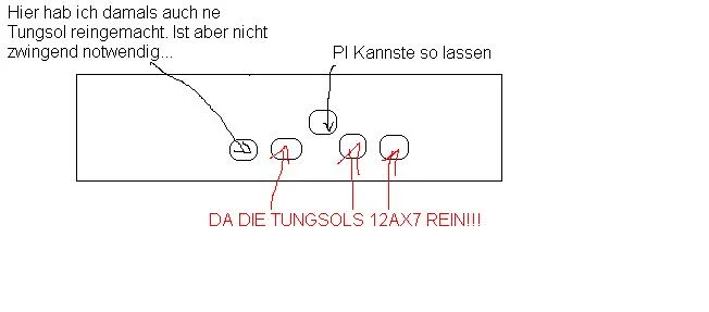 6L6GC Umbau: DIE bestellen und dann im Feld "Anmerkungen" dazuschreiben, dass man den Bulldozer (2ch recto kopie) spielt und noch den PC/TC Wert der EL34 mit angeben (steht auf der Röhre: bei mir war's PC:31 / TC: 1034)