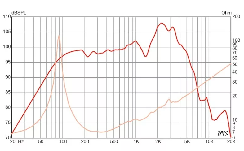 Bedeutet: Bei einer Frequenz knapp unter 90 Hz, also recht nah am normalgestimmten tiefen "E" (82,4Hz) hat der Lautsprecher eine Impedanz von über 100 Ohm, also mehr als das Zehnfache der Nennimpedanz von 8 Ohm.
