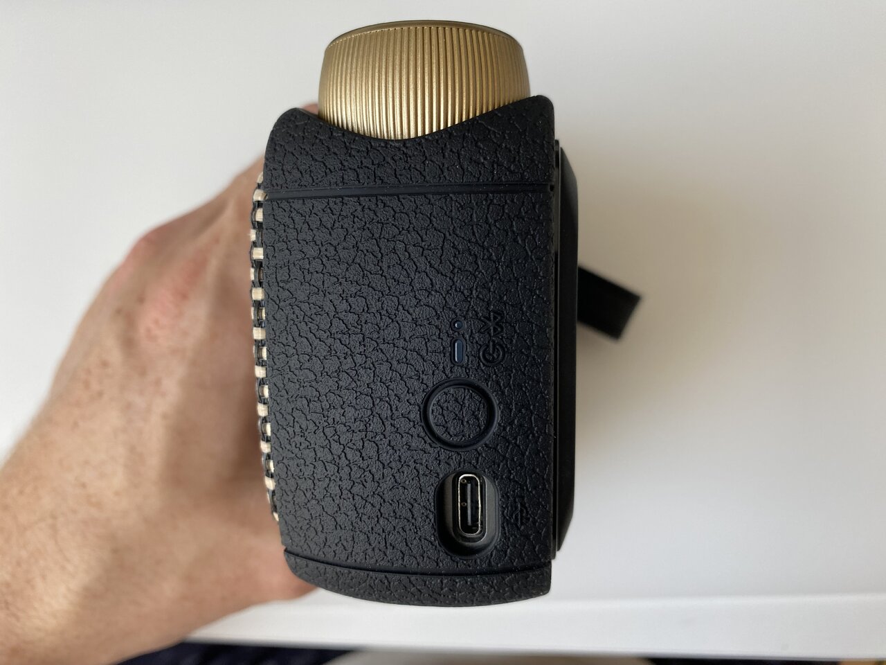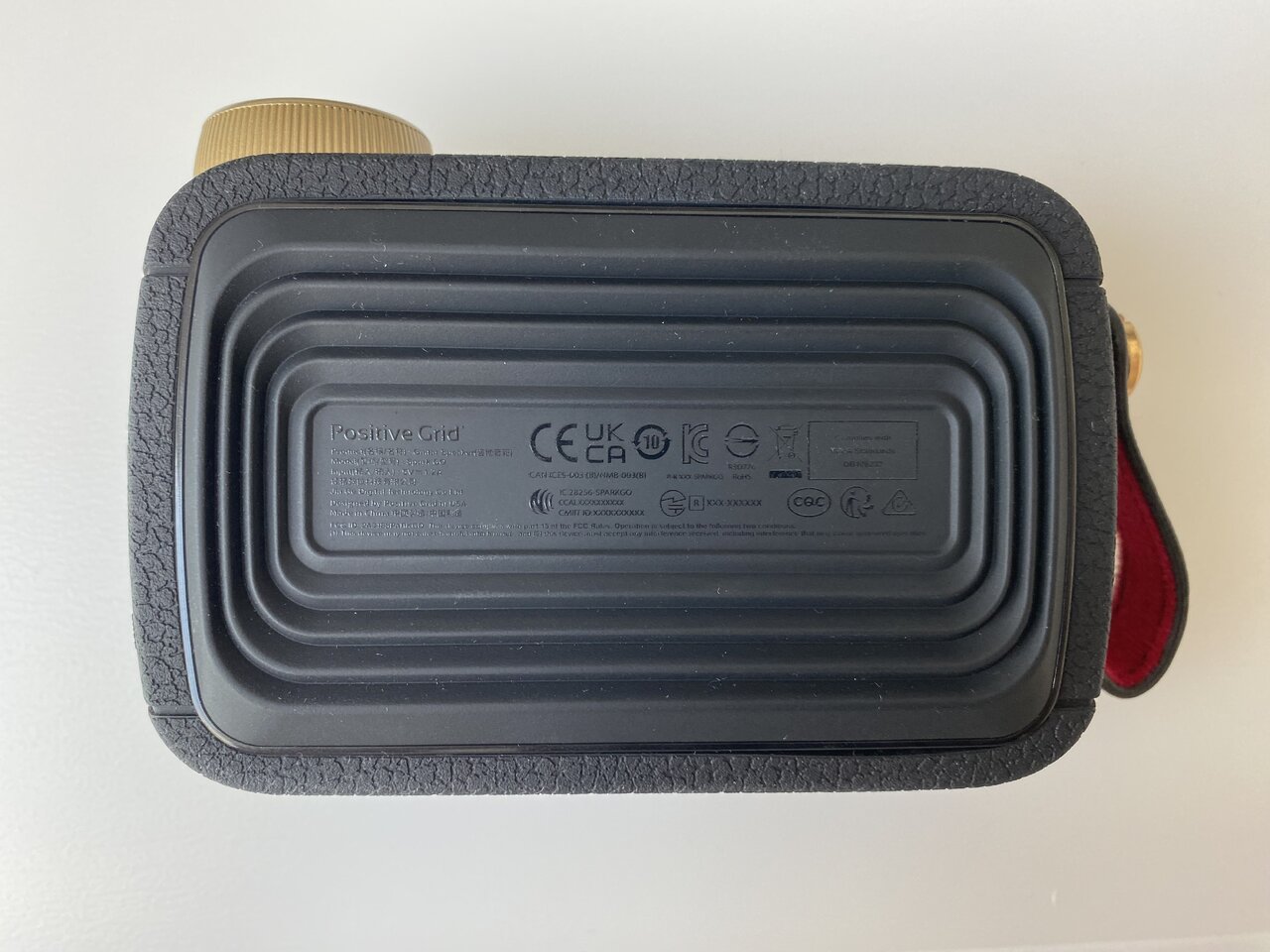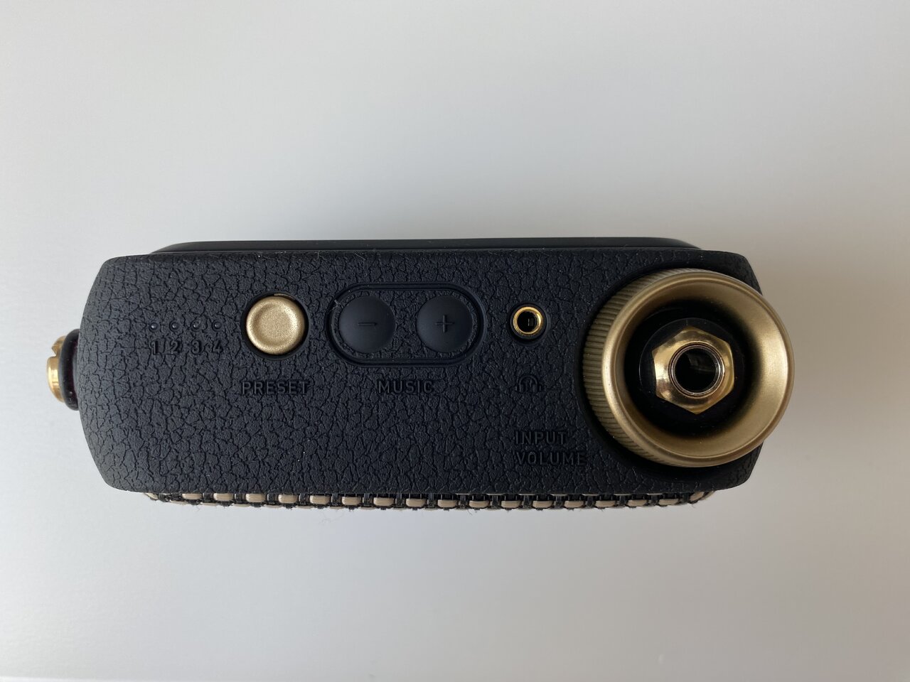 Der Spark GO hat eine Gitarrenbuchse deren Lautstärke mit dem Drehregler lauter und leiser geschaltet werden kann. Zwei Tasten für die Musiklautstärke regeln Lautstärke der Musik oder Backing-/Drumtracks die via Handy-App bzw. über Bluetooth abgespielt werden können. Über eine 3,5mm AUX-Buchse kann man einen externen Verstärker, Kopfhörer, etc. anschließen. Der Presetschalter schaltet die 4 hardwareseitigen Presets durch, bzw. ein langer Druck aktiviert den Onboard Tuner der über die 4 LED anzeigt ob man zu hoch oder zu niedrig gestimmt hat. Ansonsten gibt es noch einen On/Off Knopf der auch zur Bluetooth Koppelung dient, sowie eine USB-C Buchse zur Ladung oder zur Verbindung mit einem PC/Laptop.