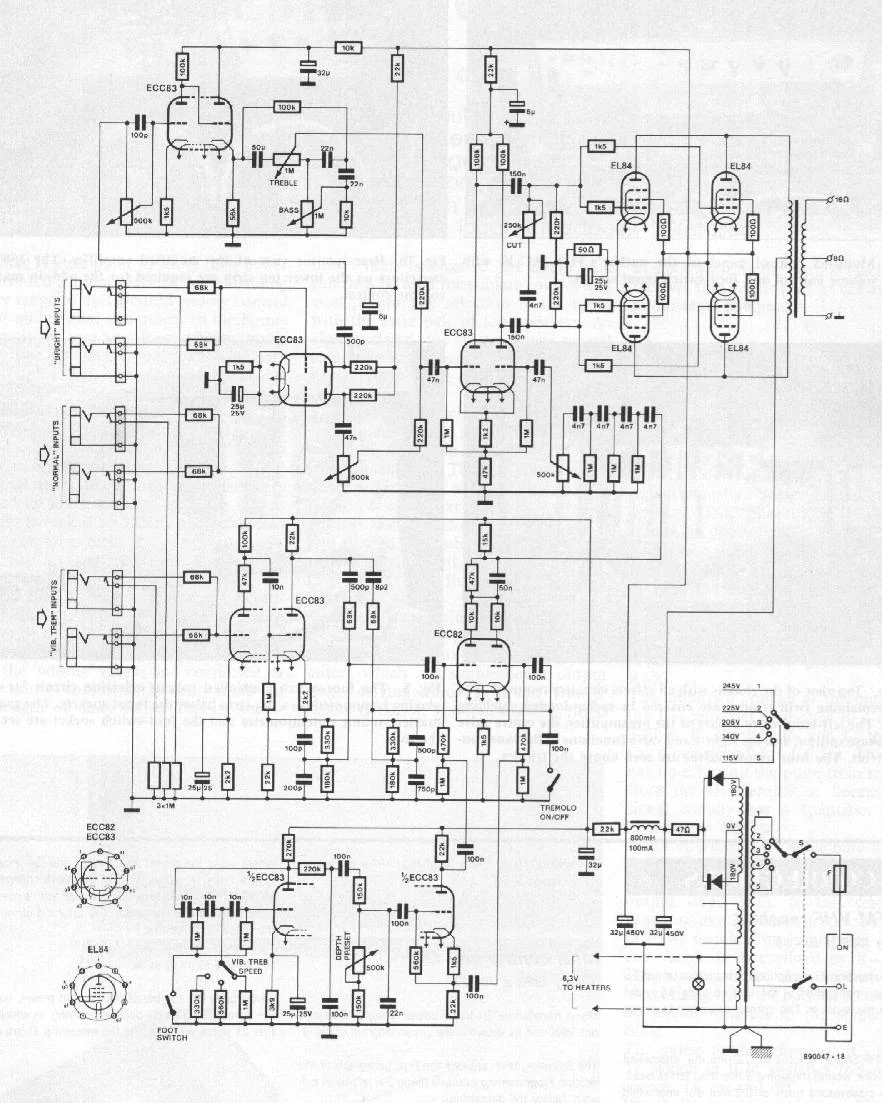Was fehlt, ist das Tremolo. Der Kanal funzt ganz normal und man hört beim Schalten des Vib/Trem-Umschalters ein Knacken und in der Trem-Stellung wirkt der Amp etwas leister, als in der Vib-Stellung. Manchmal hab ich das Gefühl, dass kurz nach dem Einschalten des Amps und Betätigen des Fußschalters ganz kurz ein leichter Tremoloeffekt zu hören ist. Der verschwindet aber so schnell dass ich nicht sicher bin, ob das vielleicht sogar Einbildung ist. Egal, der Tremolo funzt nicht, also bleibt der AC30 auf der Werkbank und der Lötkolben in Reichweite.