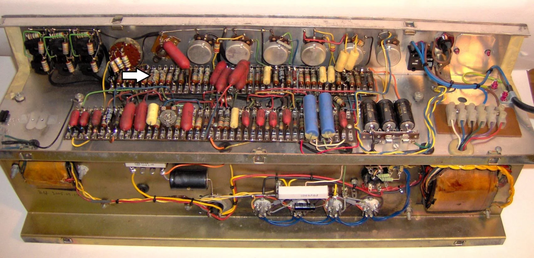 Ich hab mal ein Bild vom Innenleben (nicht von meinem Amp, aber in diesem Punkt sind sie identisch) und ein Bild vom Schaltbild angehängt. Der betreffende Widerstand ist mit nem Pfeil markiert.
