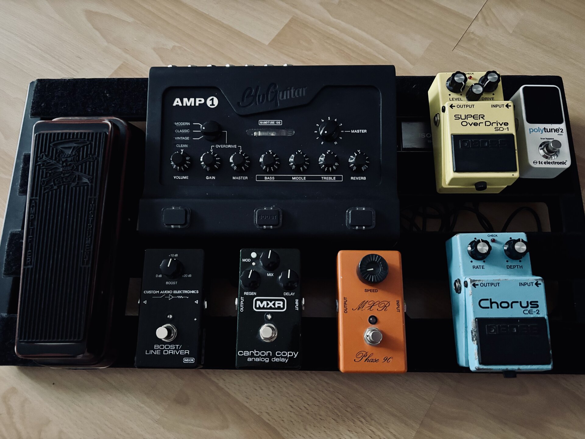 Hab mal das Pedalboard neu um den Amp1 arrangiert. Boost, Delay und Chorus sind im FX Loop, der Rest ist vor dem Amp.