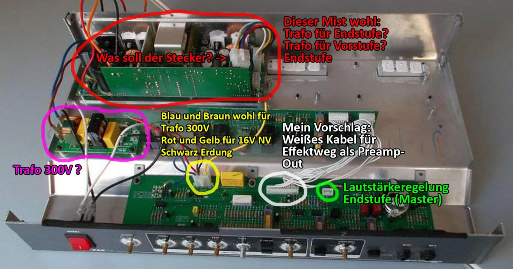 Meine Idee war es einfach die Vorstufe mit entsprechenden Trafos für HV (Röhrensektion) und NV (Preamp) zu befeuern, den eigentlichen "Effects Loop" abzugreifen und mit einer Klinkenbuchse in ein neu gebasteltes Gehäuse zu installieren.