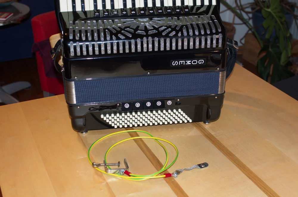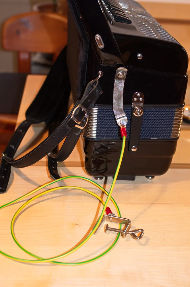 Die elektrische Aufladung die durch Reibung an der Kleidung während des Spiels auf dem Akkordeon erzeugte, wir sofort abgeleitet und das Akkordoen ist elektrisch entladen
