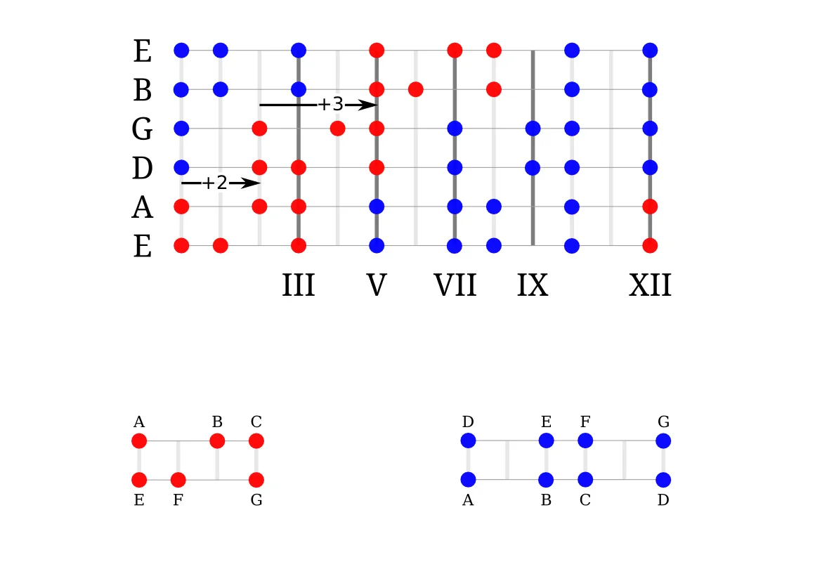 Wichtig ist, dass man sich irgendwann das "rote" und das "blaue" Griffbild auf den unteren E- und A-Saiten bis zum 10. Bund so vorstellen kann: