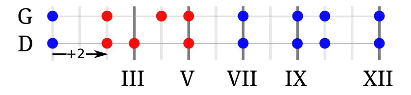 Das "rote" Griffbild startet hier ab dem 2. Bund, das "blaue" Griffbild ab dem 7. Bund.