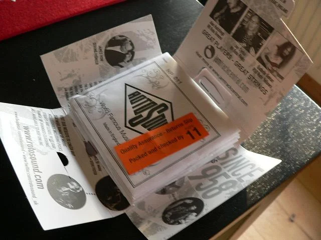 Eine Schöne stabile Plastikverpackung und jede Saite einzeln nochmal in einem Papiertütchen. Ohne nerviges Plastik oder ähnliches und ohne Hilfsmittel zu öffnen. Gefällt