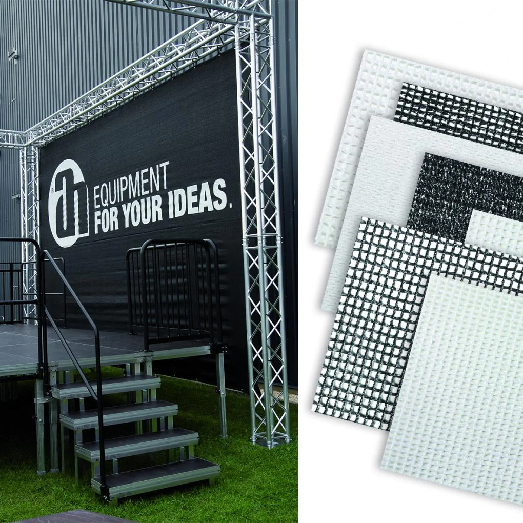 Das leichte, aber formstabile und besonders reißfeste Bühnengaze wird vor allem bei Outdoor-Events für Verkleidungen, Backdrops, Vorhänge und als Sichtschutz eingesetzt. Dabei ist die Durchlässigkeit des Materials eine wichtige Eigenschaft, die übermäßige Belastung durch Wind, Böen und Stürme verhindert und für standfeste Konstruktionen sorgt. Das Bühnengaze von Adam Hall ist in vier fein- bis grobmaschigen Typen mit unterschiedlicher Blickdichte und einer Winddurchlässigkeit von 16 bis 50% erhältlich; so lässt sich für nahezu alle Witterungsbedingungen das geeignete Material auswählen. Alle Ausführungen sind wasserabweisend, säure- und wetterfest, bis 3 Jahre UV-beständig und farbecht, abwaschbar und für Temperaturen von -30° bis 70° geeignet.