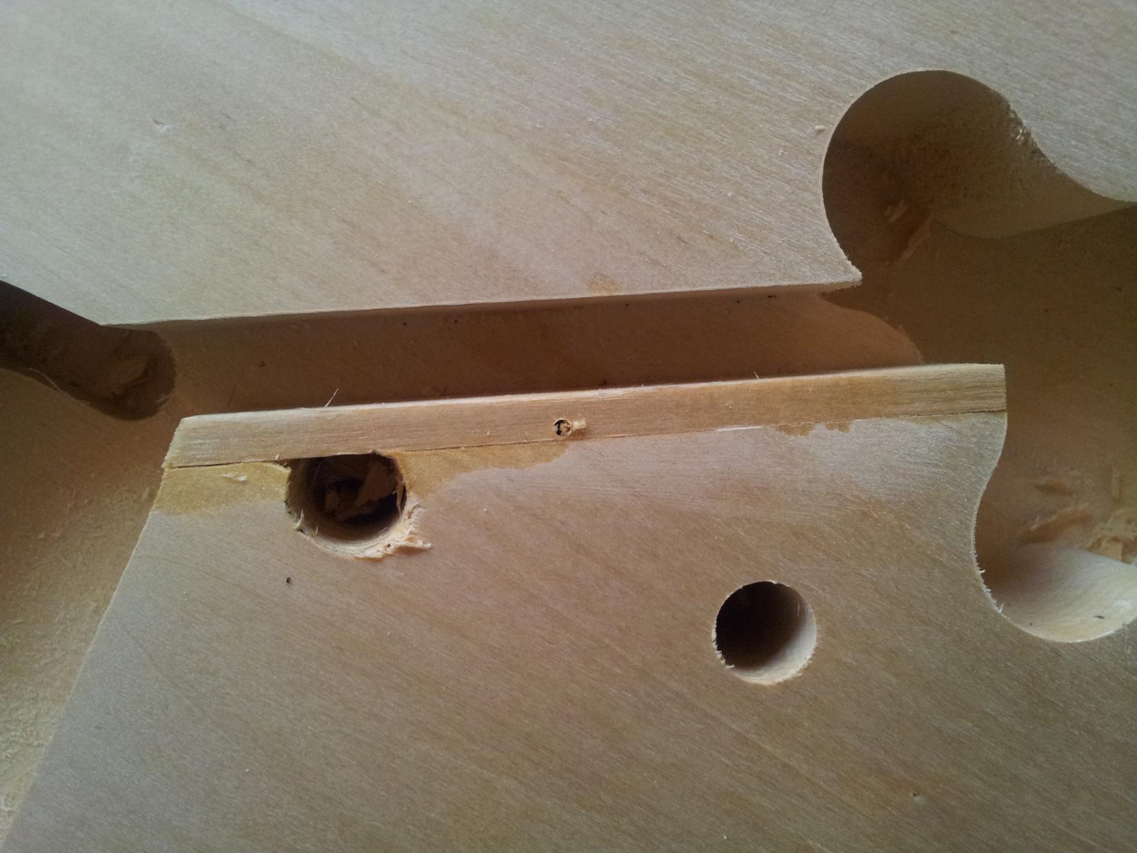 Du solltest beim nächsten Versuch (möge der Postmann bald ein zweites mal klingeln ;)) erst die Bohrung auf das angeleimte Holz erweitern, so es sein muss.