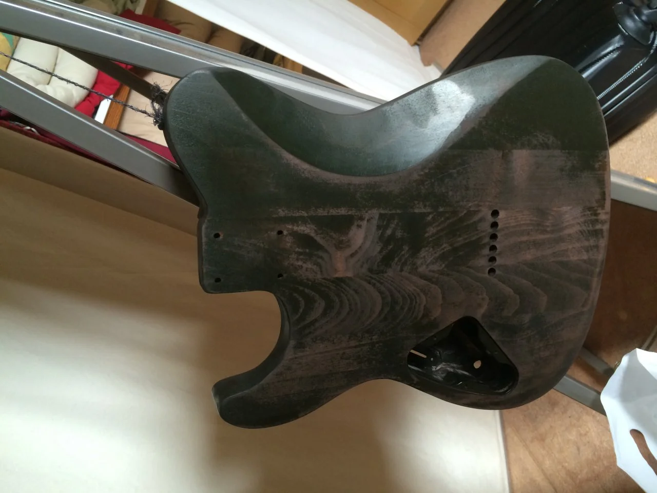 PS: Von dem Teil bei der Bauch-Ausschabung bei der Gitarre nicht verwundern lassen. Da ist noch ein Stück dünne Schicht alter Lack drauf, sonne Art "Erinnerung" an den Originalzustand und auch so gewollt. Deswegen wird auch lackiert und nicht gewachst, da ich fürchte, dass das Wachs an der Stelle nicht groß halten würde.