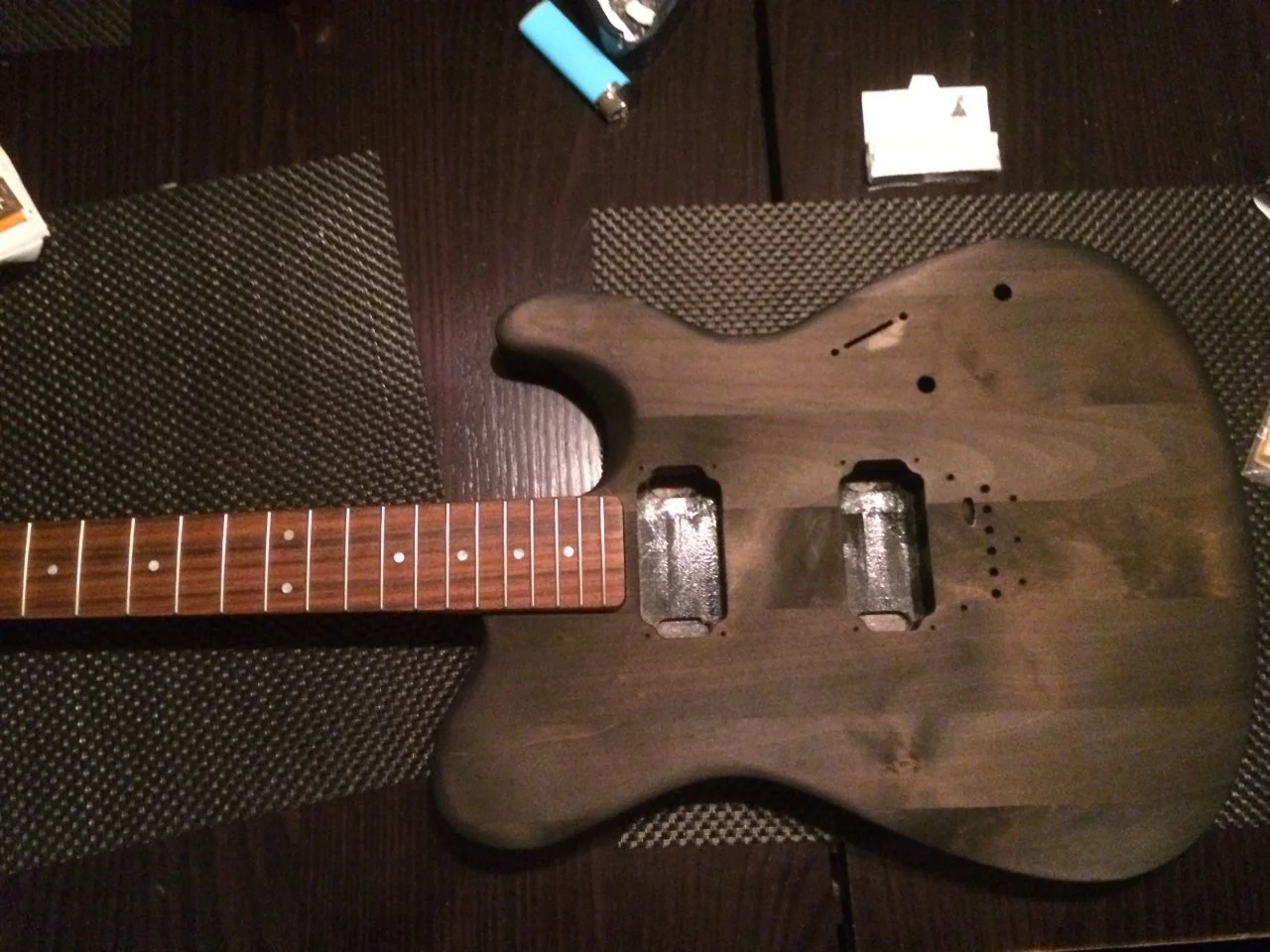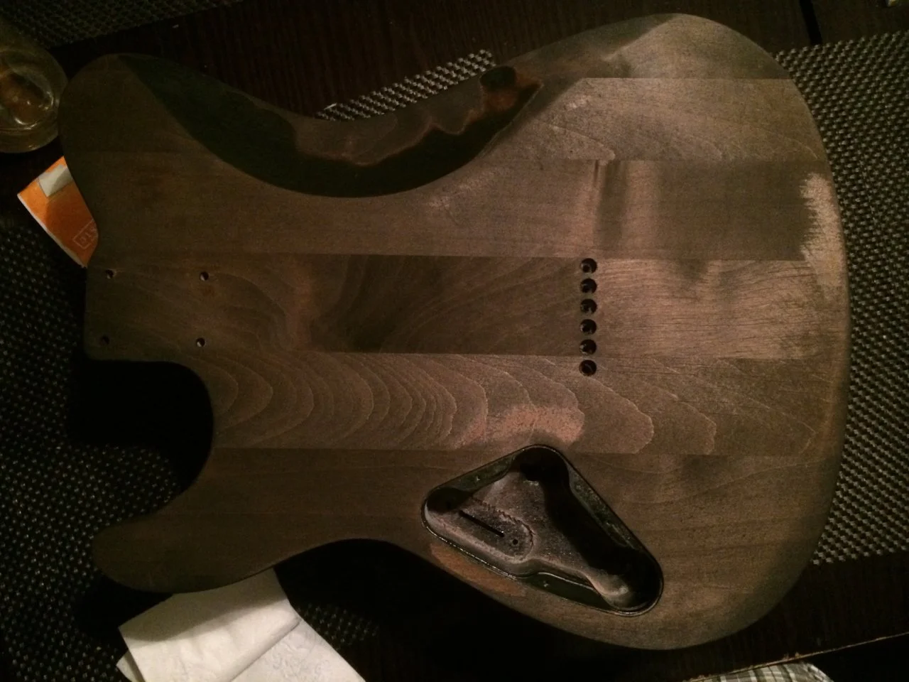 Finde das jetzt alles schon schick, und bin auch recht zufrieden. Frage mich nur, ob ich jetzt noch mehrfach mit Beize drüber sollte, um es gleichmäßiger zu kriegen, oder ob die Flecken so oder so etwas bleiben werden (womit ich durchaus leben könnte, ärgern tut mich nur der eine recht starke Fleck am Pickup-Wahlschalter) Dass da wirklich noch Grundierungsreste waren, kann ich mir eigentlich nicht vorstellen. Ich hab den Korpus echt schon geschliffen wie ein IrrerPech mit dem Holz? Kann das sein?