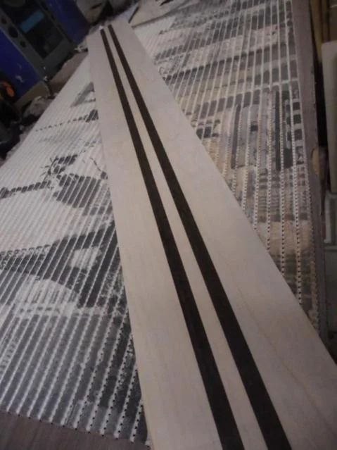 Hier kommen dann die Stäbe/L-Profile rein und dann kommt ein passendes Holzstück auf den Stab, wie ein Skunkstripe an einer Strat.