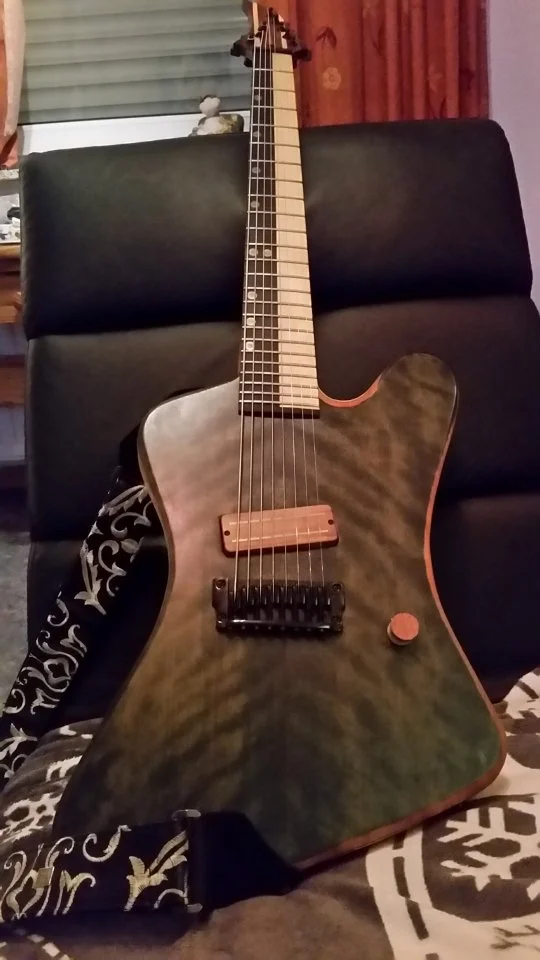 Die Bespielbarkeit ist für mich als eigentlicher Bassist perfekt, lediglich der 7. Bund kratzt ein wenig an den hohen Saiten, das lässt sich aber sicher schnell beheben. Das zweiteilige Griffbrett sieht natürlich schon von weitem richtig genial aus und von nahem gibt es noch die Patronenhülsenböden zu sehen, ebenfalls eine geniale Idee! Das Deckenholz ist ebenfalls total schick, der Preis der Gitarre könnte locker rein von der oberflächlichen Optik auf vierstellig geschätzt werden. Kleine Lackfehler sind da, aber die sind mir Wurscht, die trüben in keinster Weise den Eindruck dieser Gitarre!