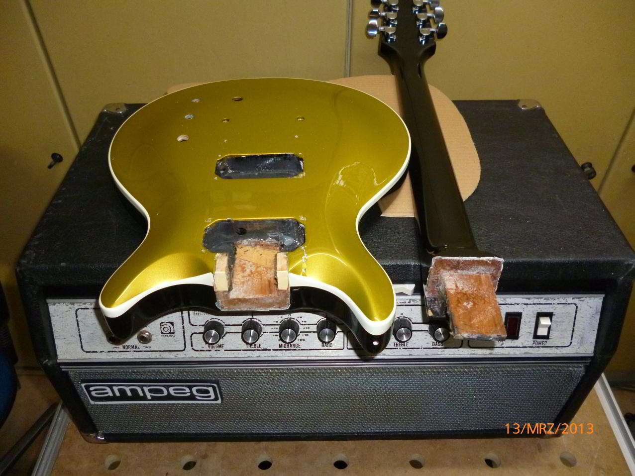 Erst war er Mausgrau dann Grün Gelb, mit einer sagen wir mal individuellen Humbucker Modifikation am Hals. Zuletzt war sie komplett schwarz, da mir das aber alles nicht gefallen hat( wie schon erwähnt Learning by Doing und ab und an ist das alte Doing kein Doing sondern Murksing), hab ich bevor es überhaupt weiterging nochmal eine Fräsung individualistisch erweitert was sagen wir mal "Scheisse" aussah.