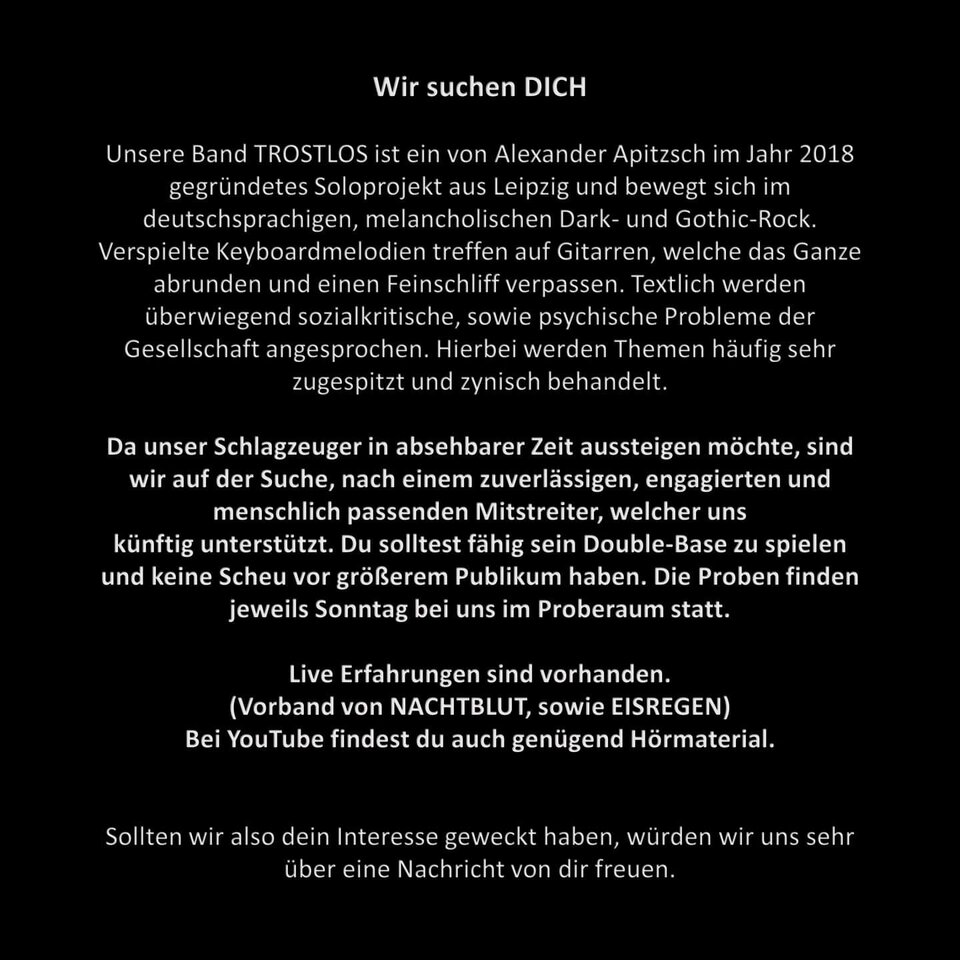 Unsere Band TROSTLOS ist ein von Alexander Apitzsch im Jahr 2018 gegründetes Soloprojekt aus Leipzig und bewegt sich im deutschsprachigen, melancholischen Dark- und Gothic-Rock Verspielte Keyboardmelodien treffen auf Gitarren, welche das Ganze abrunden und einen Feinschliff verpassen. Textlich werden überwiegend sozialkritische, sowie psychische Probleme der Gesellschaft angesprochen. Hierbei werden Themen häufig sehr zugespitzt und zynisch behandelt.