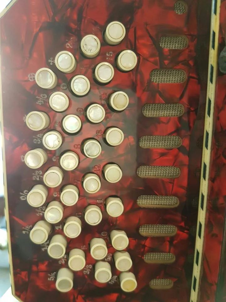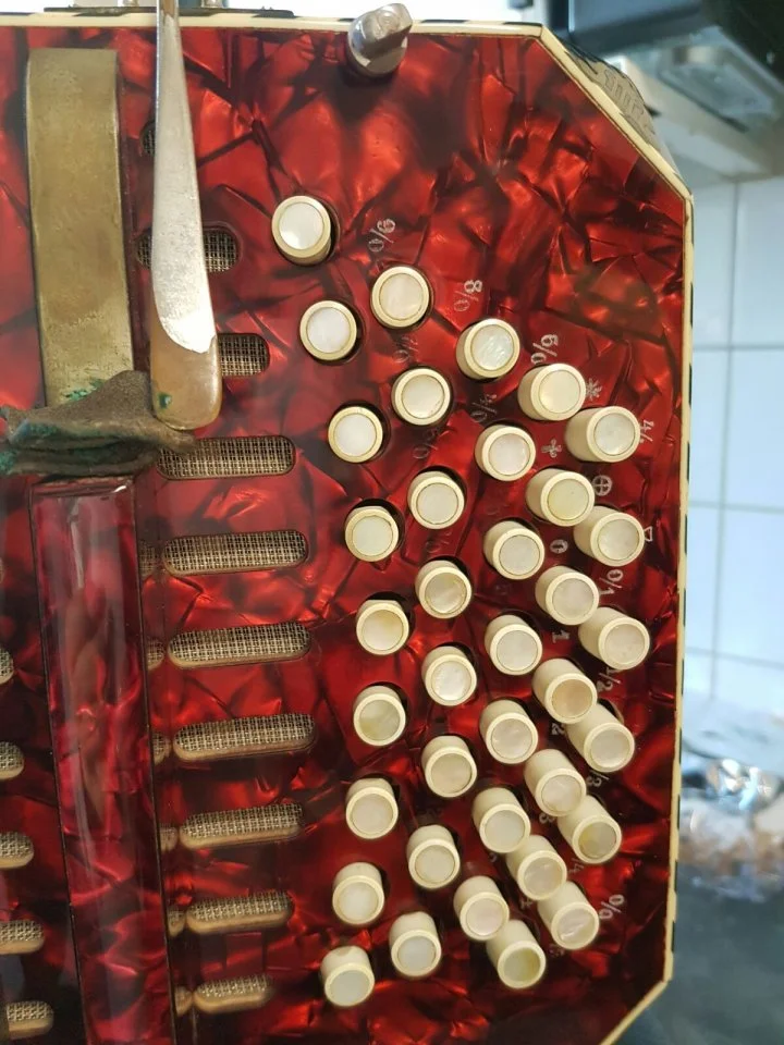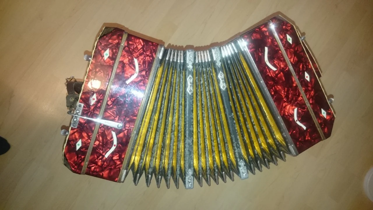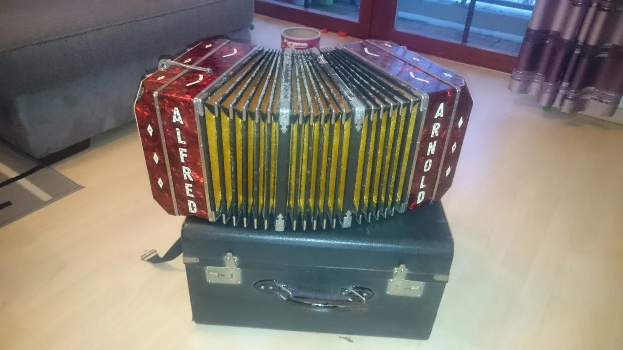 Ich habe ein Bandoneon bekommen auf dem der Name Alfred Arnold steht. Es ist rot und hat an den Kanten ein Harfenähnliches Symbol. Die Farbe des Balges ist gelb. Ich habe leider keine Serienummer oder eine Bezeichnung gefunden. Können Sie mir vielleicht einen Tip geben wo ich mehr über dieses Bandoneon erfahren kann. Ich habe auch schon ein paar Beiträge gelesen das man das Innenleben anschauen soll. Aber ich habe absolut keine Erfahrung damit und wüsste auch nicht wo ich ansetzten sollte. Da habe ich mehr Angst etwas kaputt zu machen.